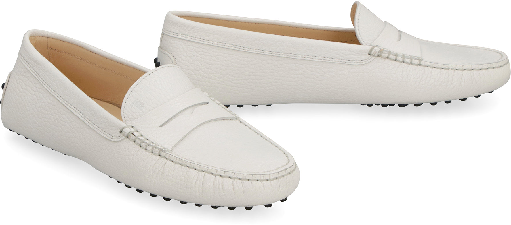 Elevate your style with these luxurious Gommino leather loafers. Crafted from premium cream-colored grained calfskin, these loafers feature visible stitching and an embossed Tod's logo on the front, showcasing the brand's exquisite attention to detail. The rubber pebble detailing on the heel and sole adds a touch of modernity to the classic design, making these loafers the perfect blend of sophistication and contemporary style. Whether you're dressing up for a special occasion or adding a touch of elegance to your everyday look, these Italian-sized loafers are sure to make a statement.
