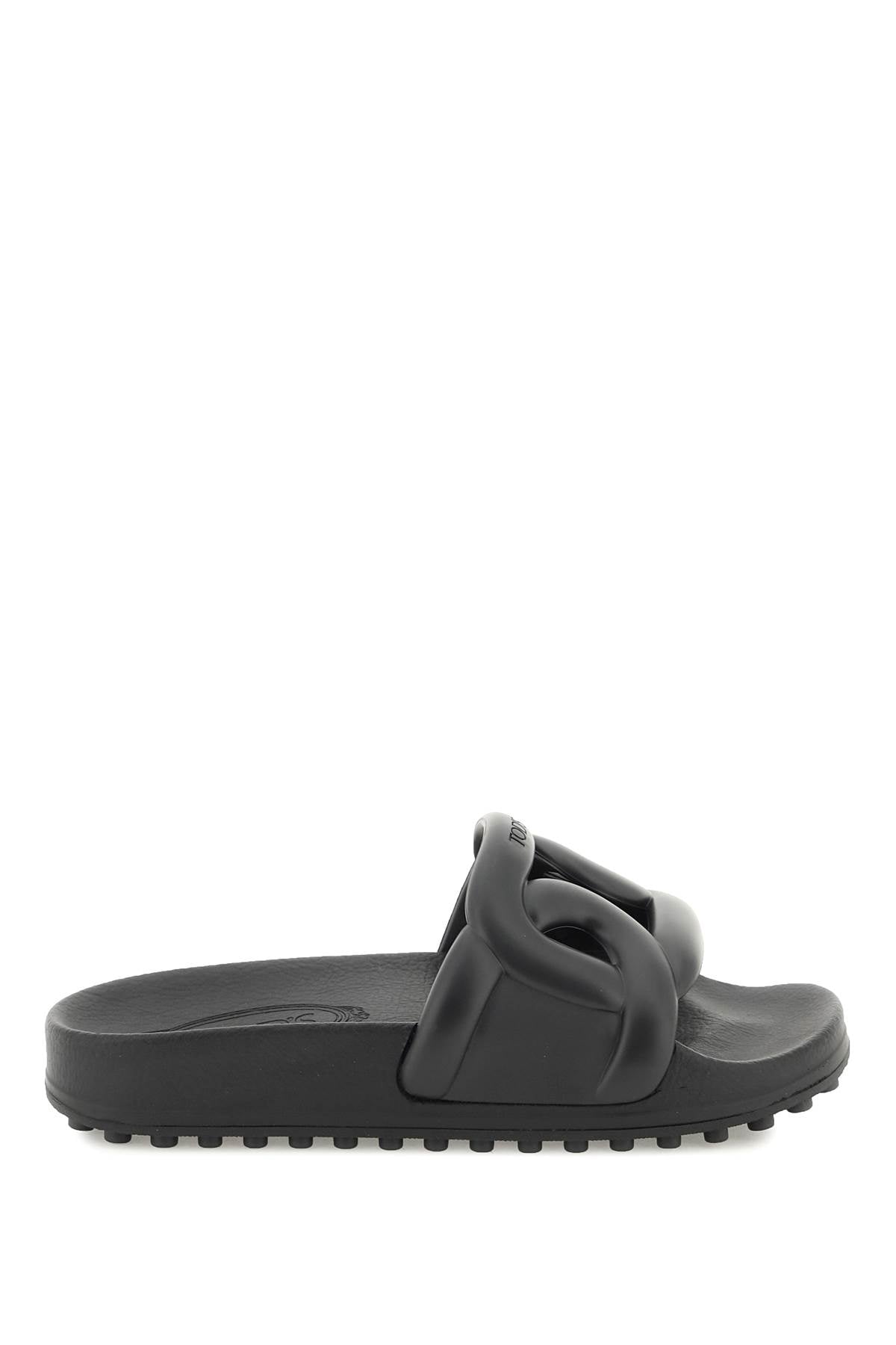 Elevate your casual footwear game with these luxurious rubber slides featuring a molded band in the iconic chain shape. Perfect for those who appreciate the finer things in life, these TOD'S slides are crafted entirely of high-quality rubber for durability and style. The anatomical footbed provides all-day comfort, while the rubber sole with pebbles adds a touch of sophistication to any outfit. Whether you're lounging poolside or running errands in the city, these slides are a must-have addition to your designer shoe collection.