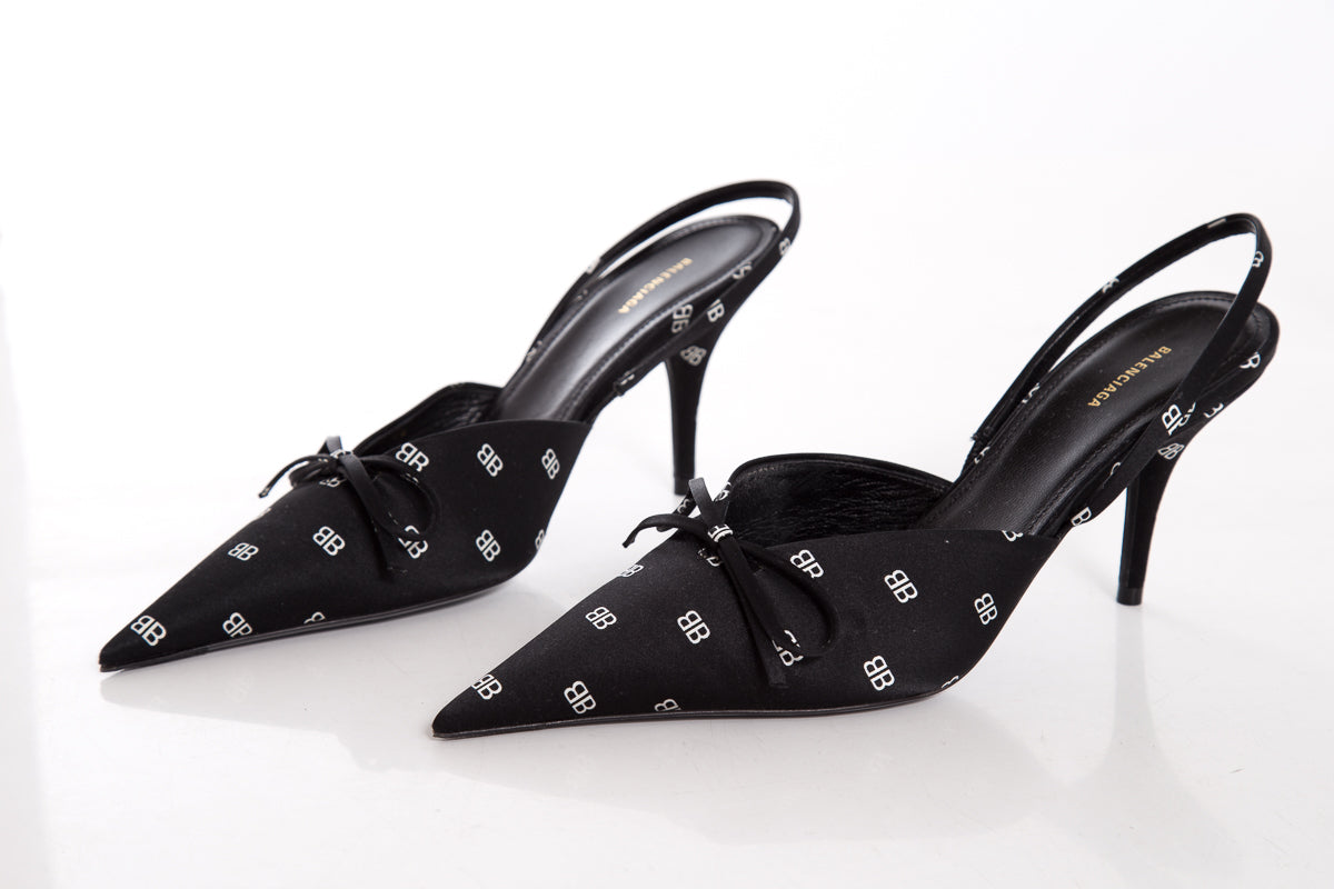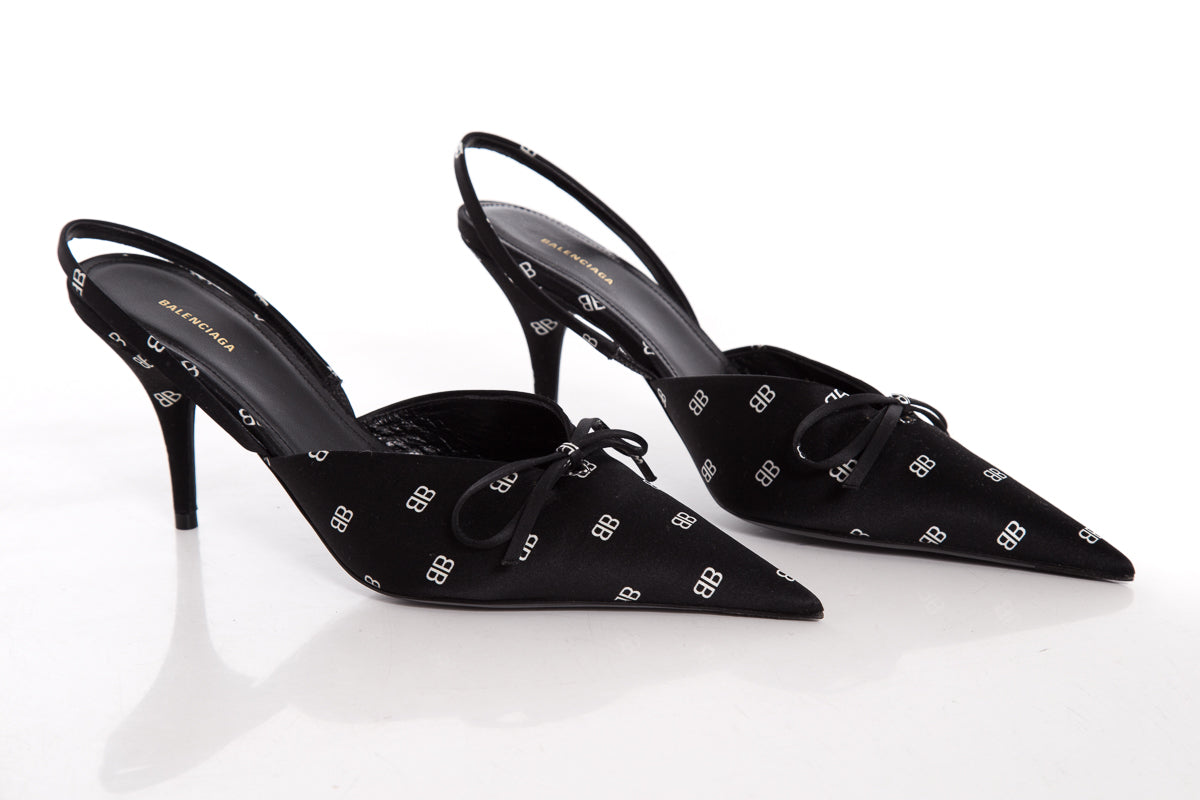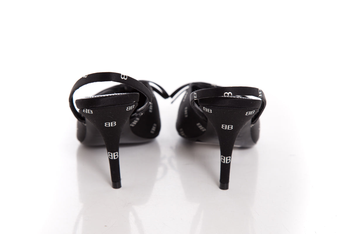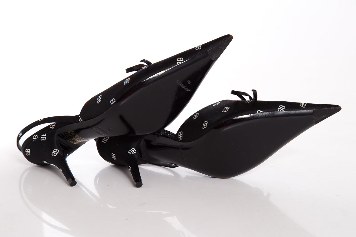 Balenciaga black satin logo slingback heels with bow. This item is in very good condition.