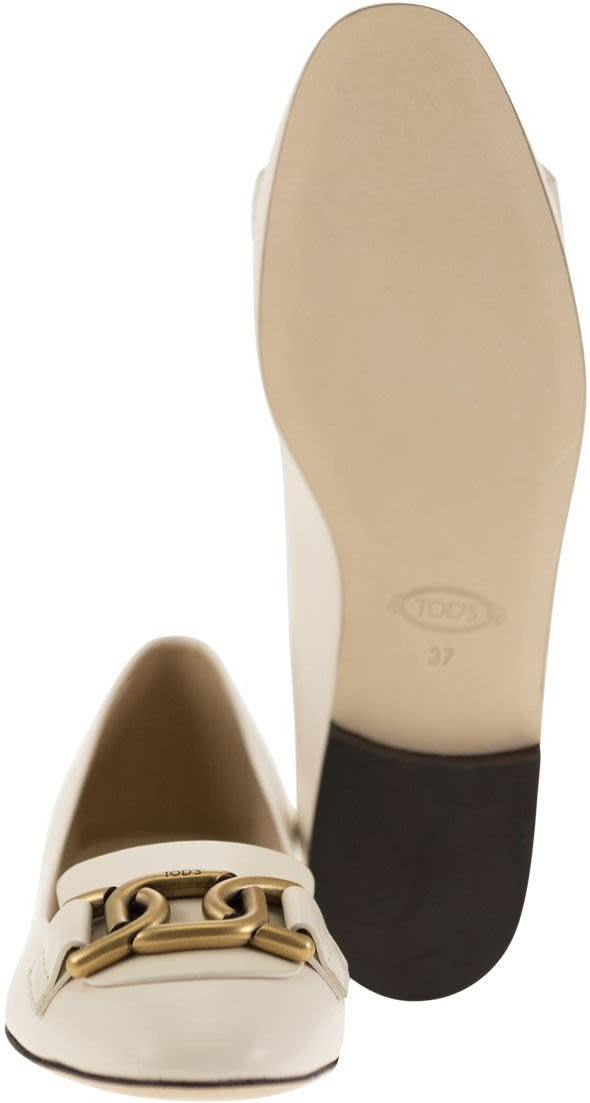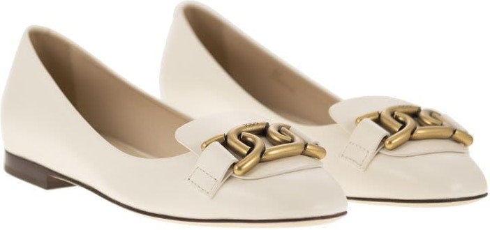 Step into comfort and style with these brushed calfskin ballerina flats, complete with a personalized metal chain accessory for a touch of sophistication. The leather sole and insole provide all-day comfort, making them the perfect choice for any occasion.