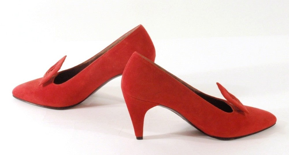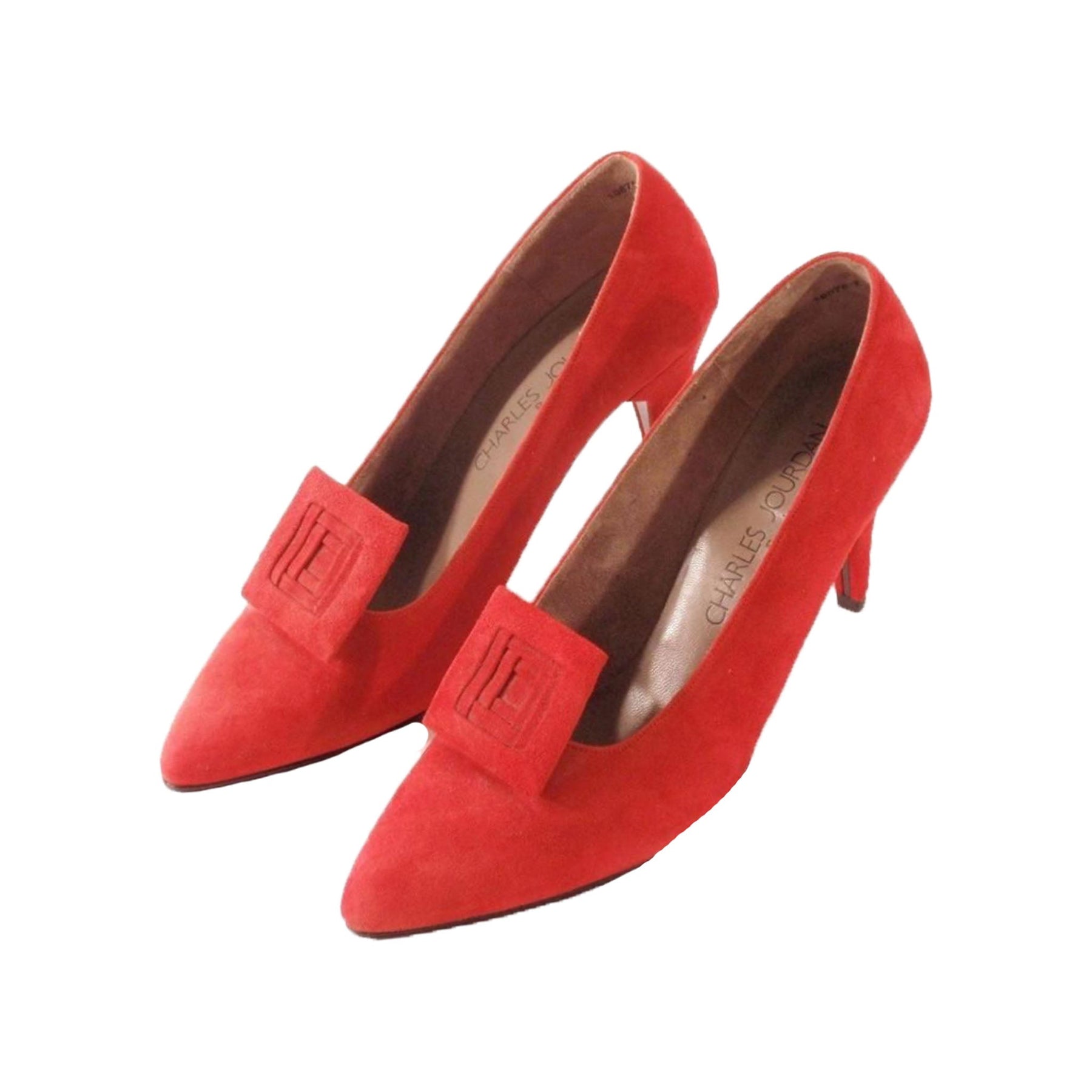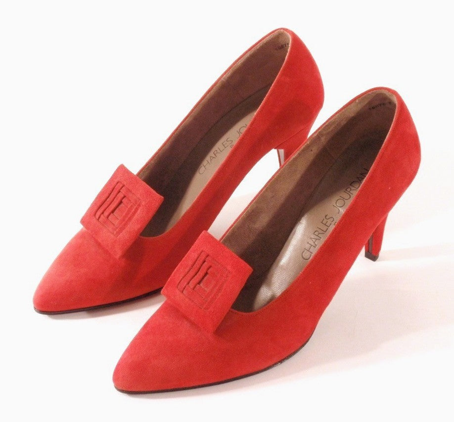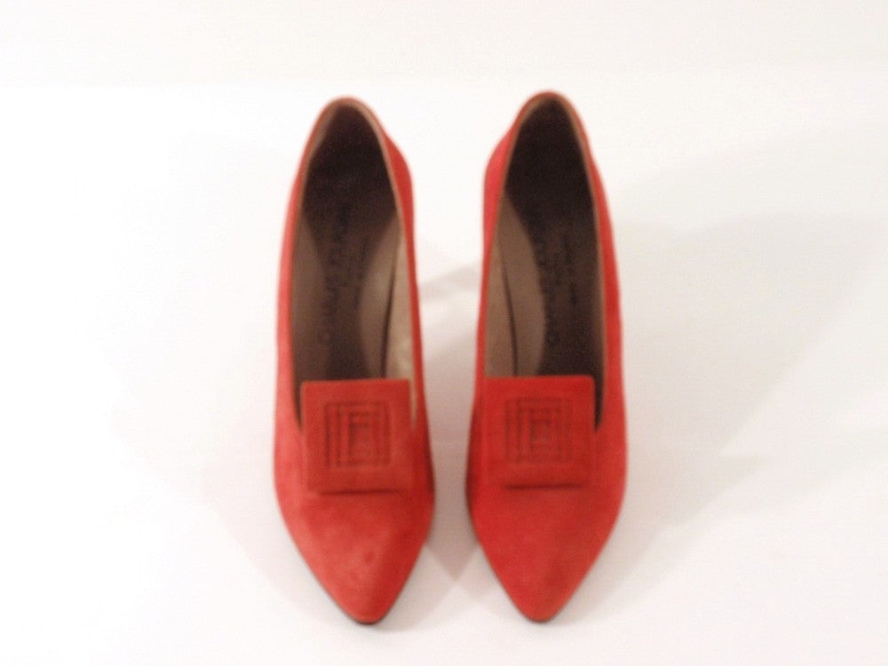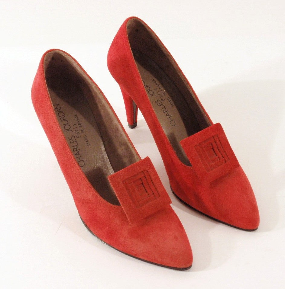 with a prominent square detail that contrasts nicely with the pointed toe.