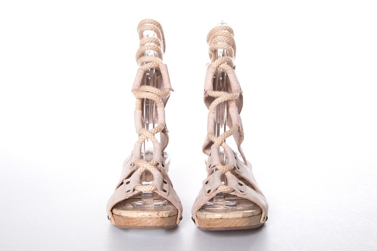 Derek Lam pebbled leather sandal with wood and cork detailing, wrapped heel, tonal stitching, stud embellishment and lace up closure. Some minor dicolorations to leather. Light wear to soles and insoles.