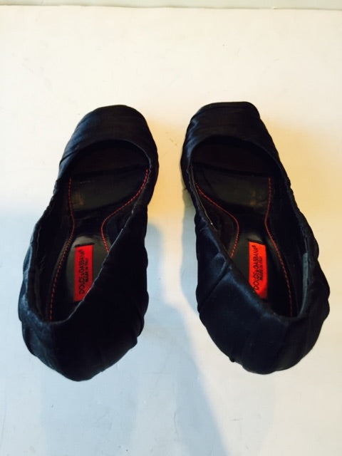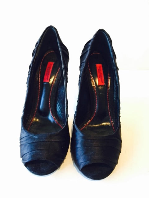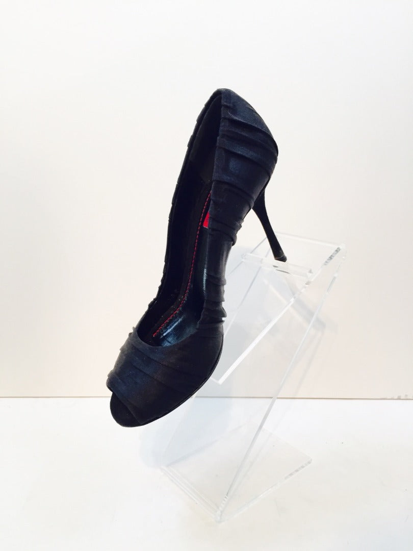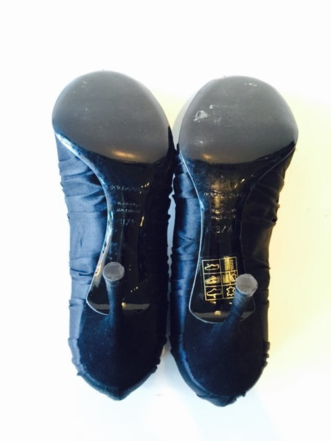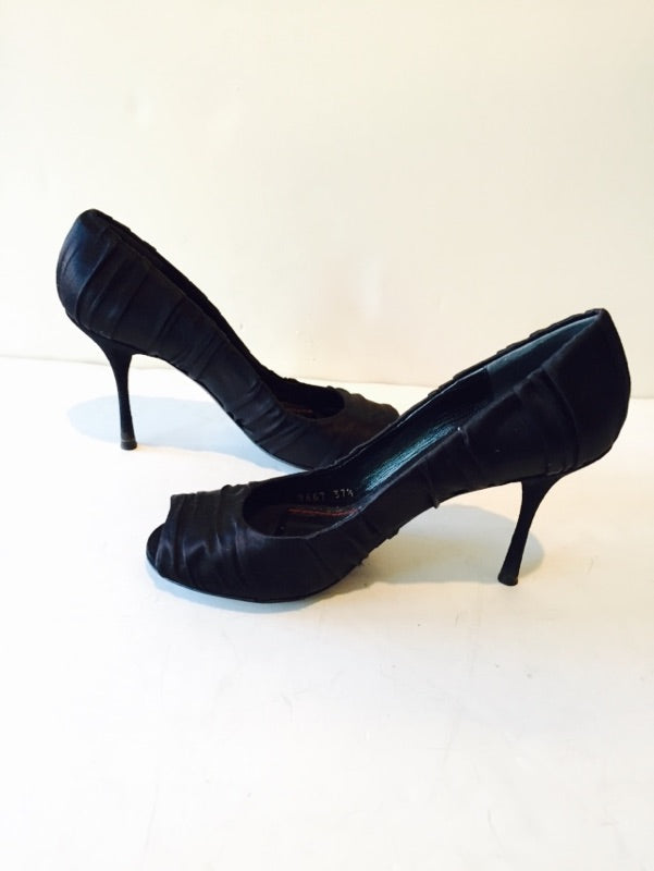 Here is a pair of black rouched satin open toe heels by Dolce & Gabbana up for your consideration. This pair is in good condition, with some wear on the bottom sole. Please view photos for additional details.