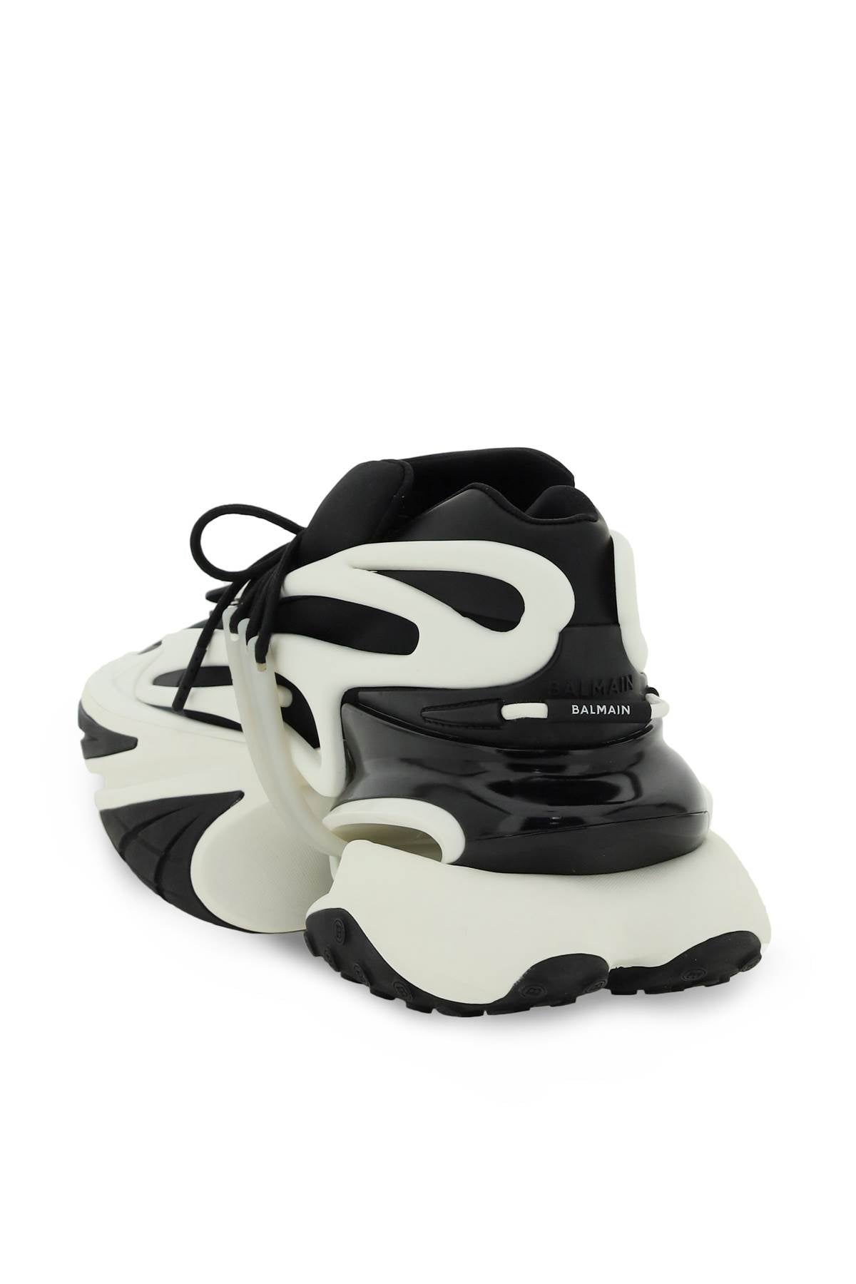 UNICORN SNEAKERS BY BALMAIN CRAFTED IN NEOPRENE WITH CONTRASTING RUBBER APPLICATIONS AND LEATHER TAB DETAIL ON FRONT WITH PRESS-STUD AND TRIDIMENSIONAL LION HEAD APPLICATION. HEEL RUBBER INSERT WITH EMBOSSED LETTERING LOGO AND LACE LOOP WITH RUBBER LOGO INSERT. LACE-UP CLOSURE, CONTRASTING EMBOSSED LETTERING LOGO ON THE TONGUE, FABRIC LINING WITH REMOVABLE INSOLE, BICOLOUR RUBBER SOLE WITH CUT-OUT DETAIL AND SIDE DEBOSSED LOGO.