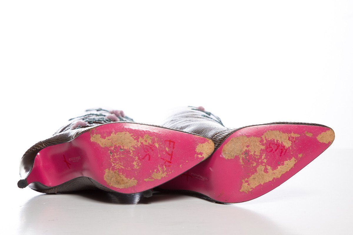 Showing normal sole wear. Reptile skin showing wear throughout from normal use and natural aging. Light wear at toes and heels.