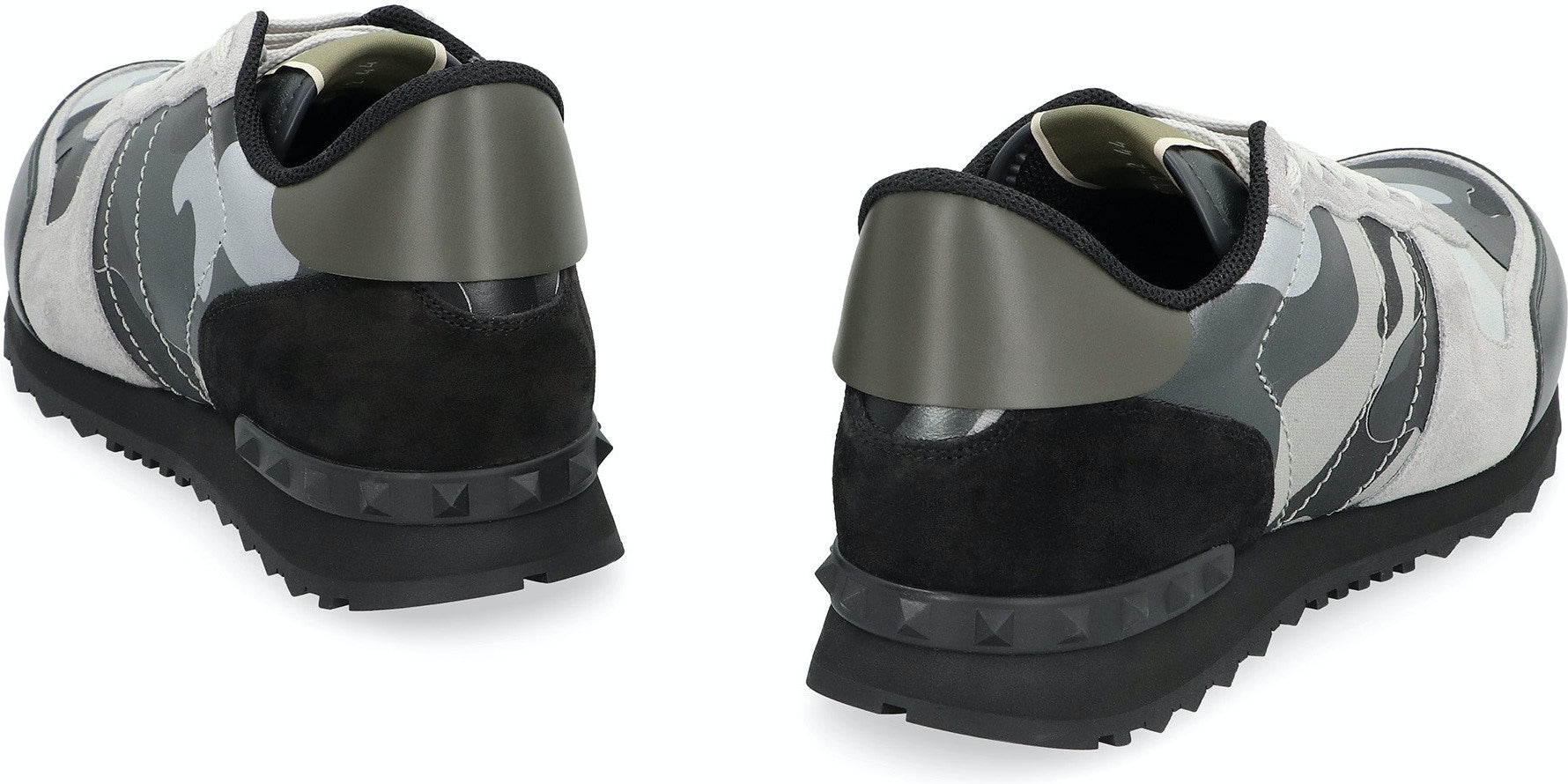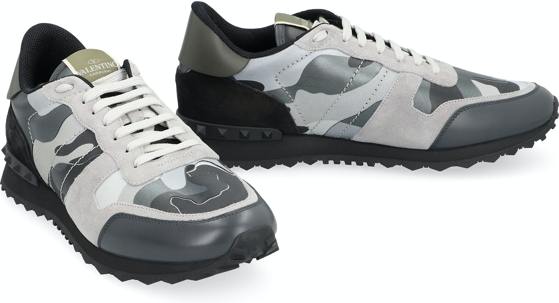 Elevate your sneaker game with these VALENTINO GARAVANI Rockrunner camouflage-print sneakers. The combination of suede inserts and decorative studs gives them a unique and edgy look that's sure to turn heads. From casual outings to nights out on the town, these sneakers are the perfect statement piece for any fashion-forward individual.