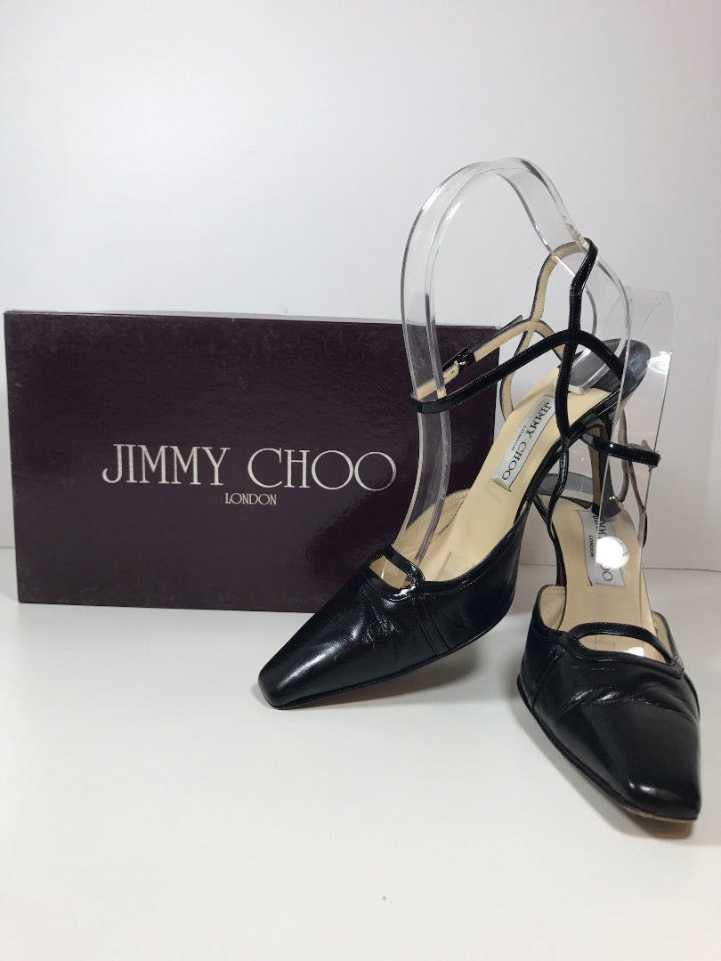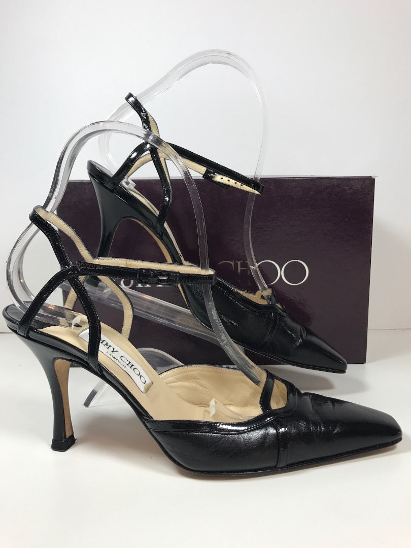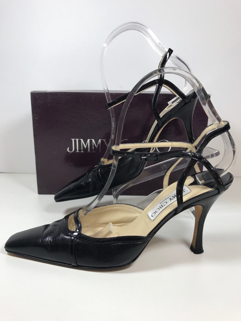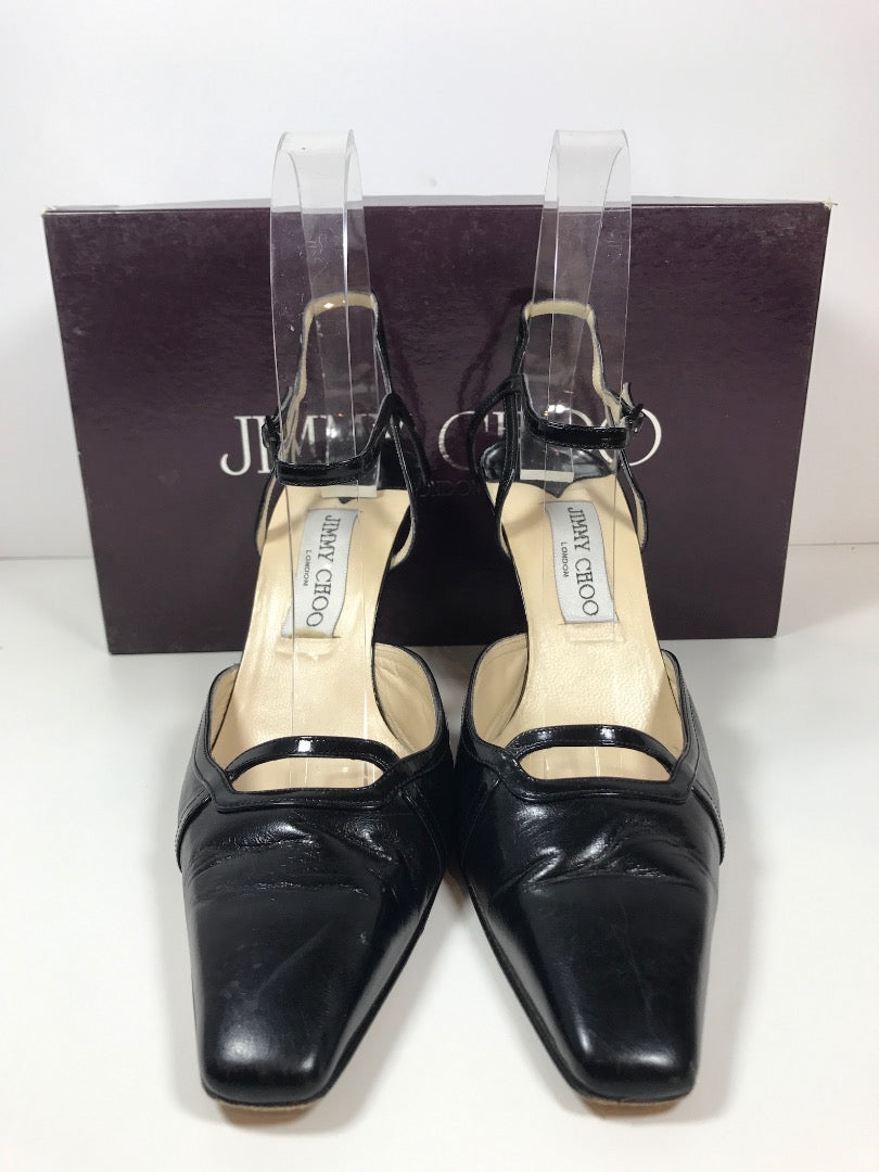 Super Sophisticated Black Leather Heels Made by Jimmy Choo. Patent Leather detailing along Top line, ankle strap, and Vamp cut out.