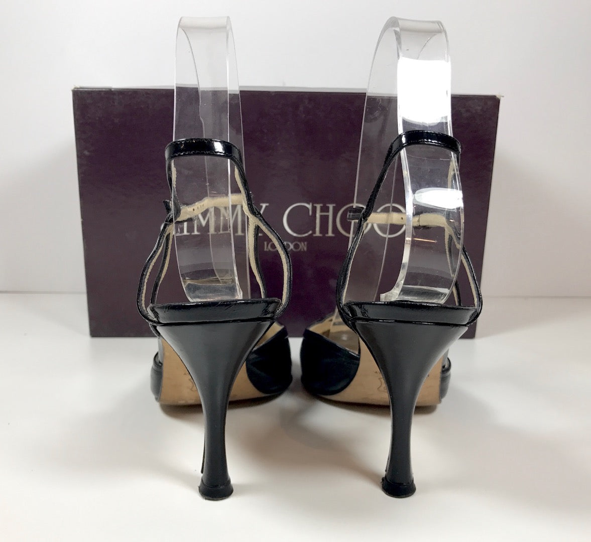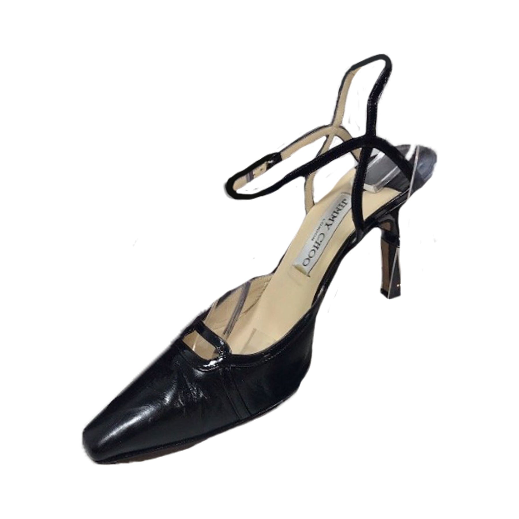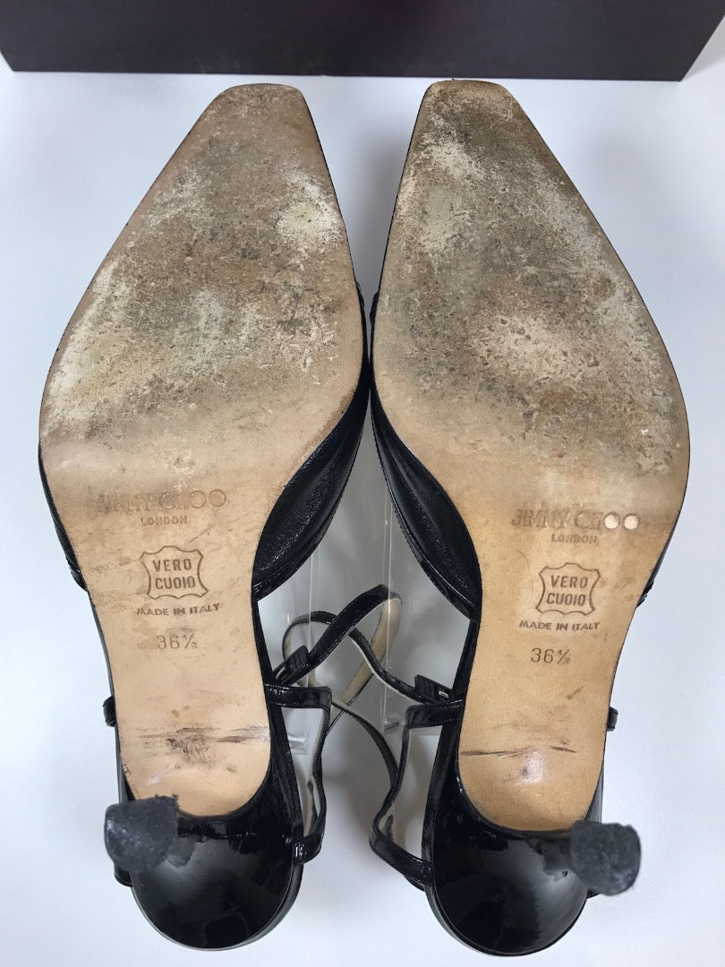 Super Sophisticated Black Leather Heels Made by Jimmy Choo. Patent Leather detailing along Top line, ankle strap, and Vamp cut out.