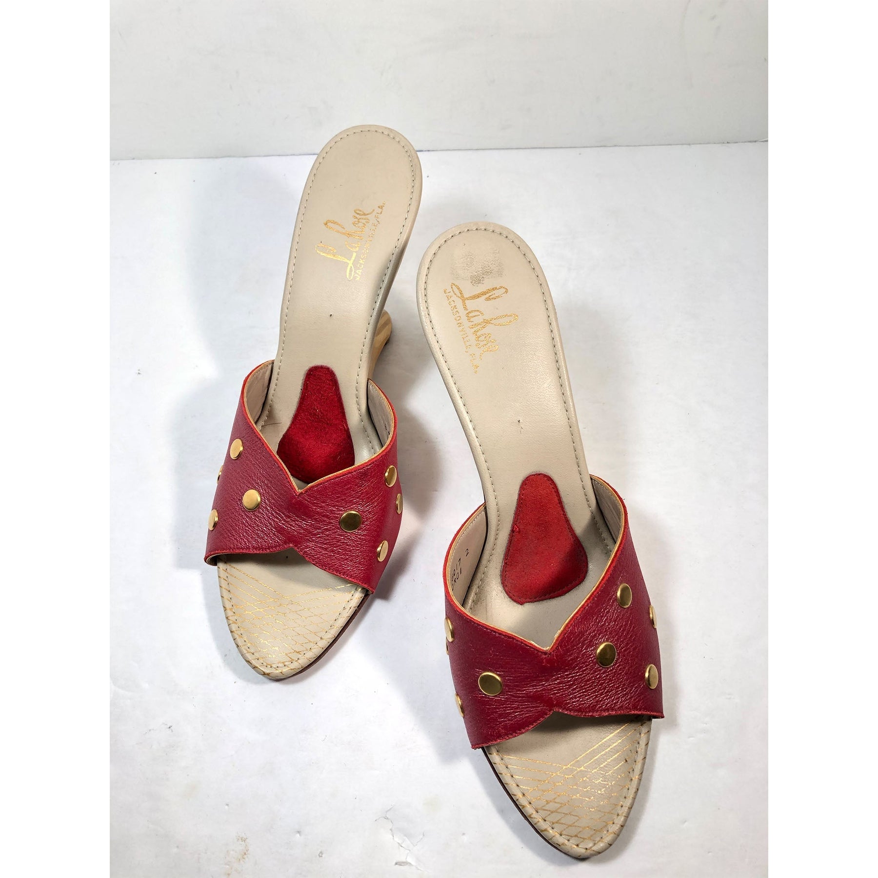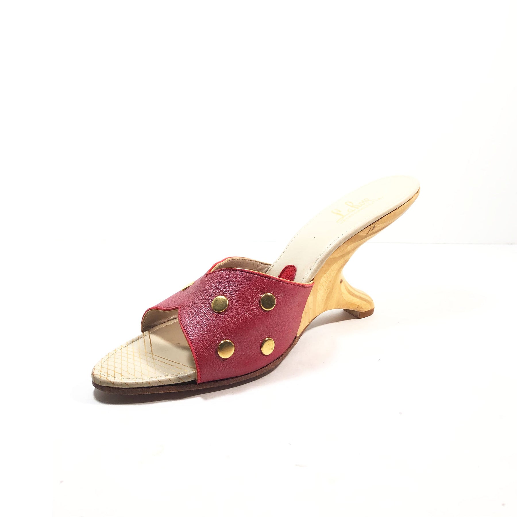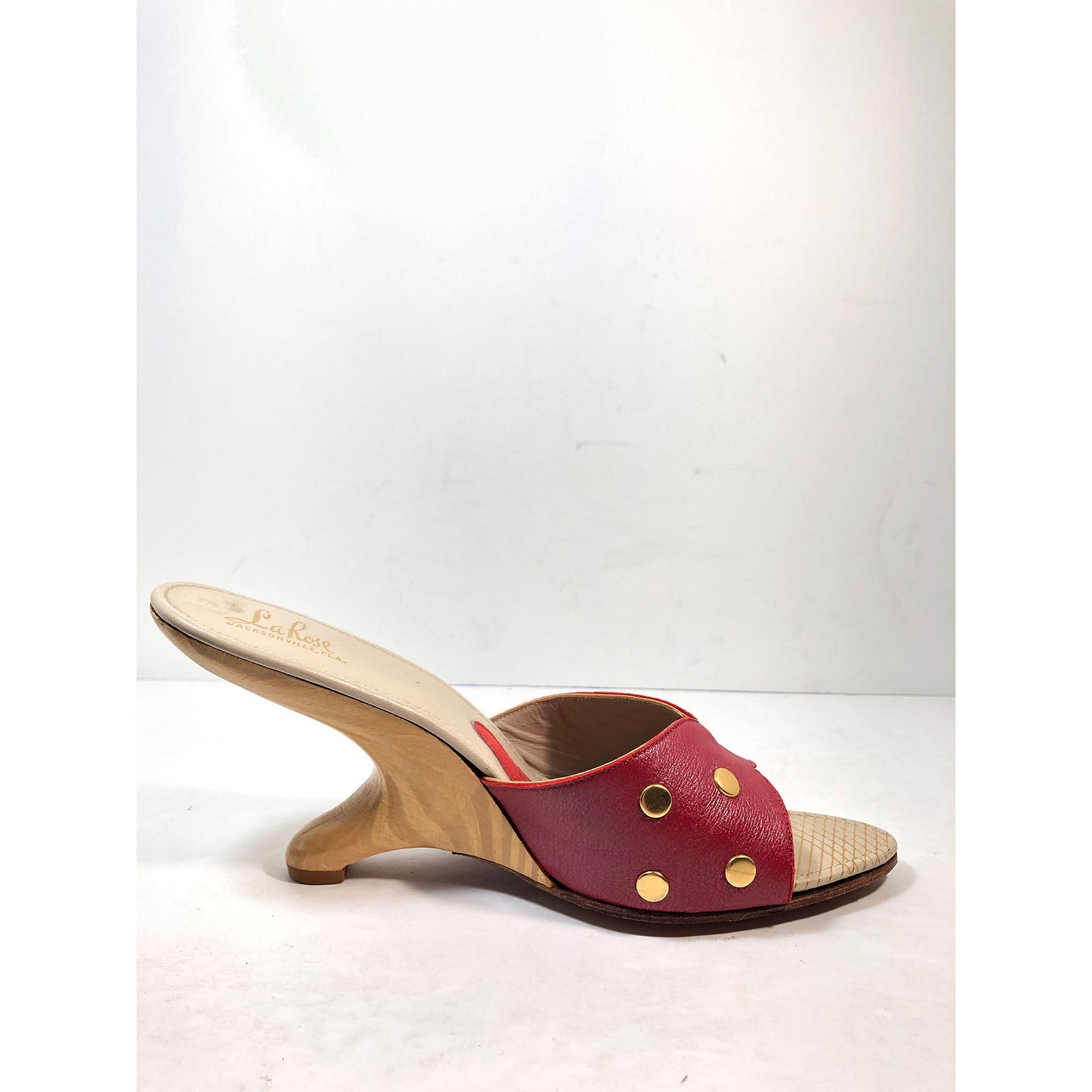 LA ROSE Red Leather w/ Gold Detail & Wooden Boomerang Heels