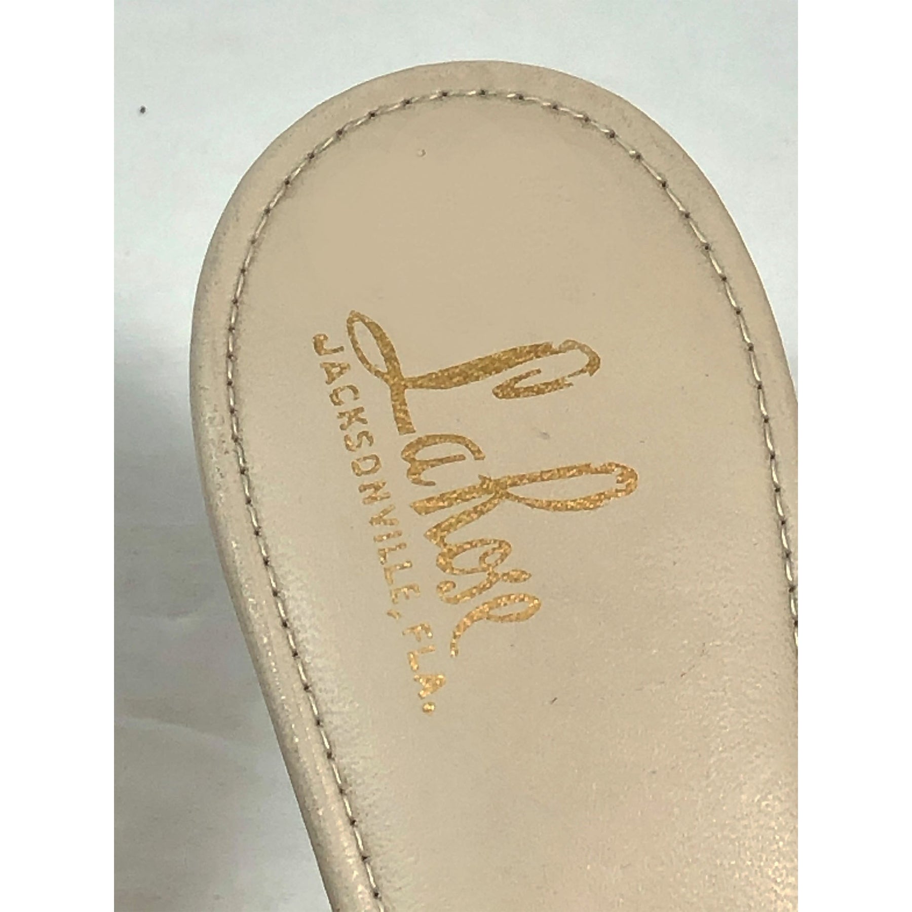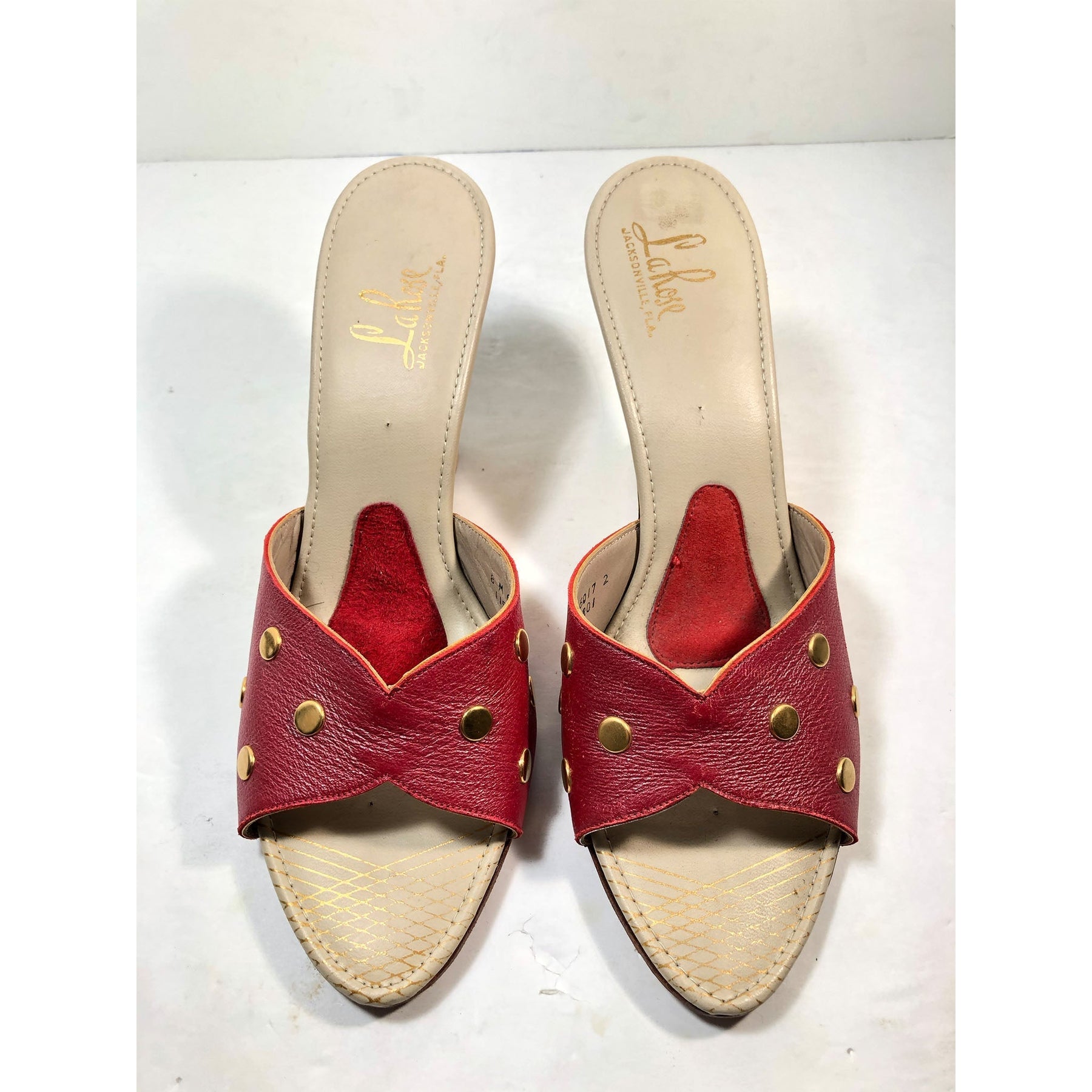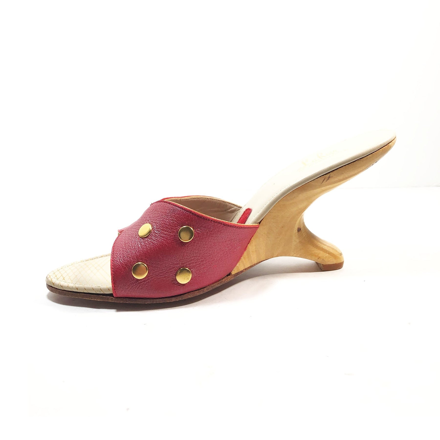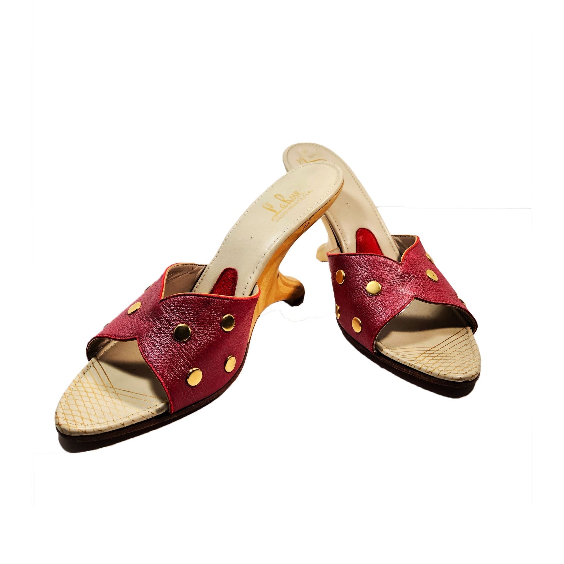 LA ROSE Red Leather w/ Gold Detail & Wooden Boomerang Heels