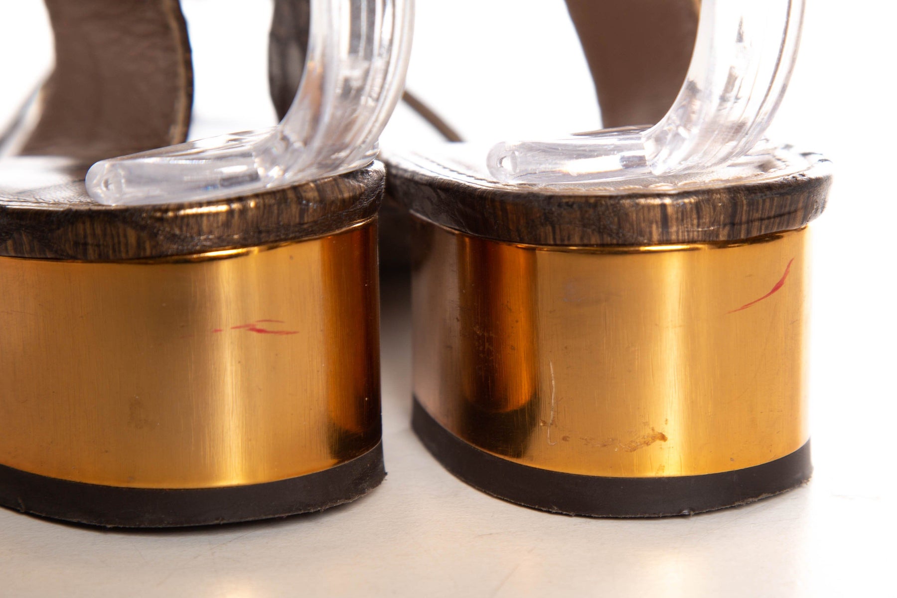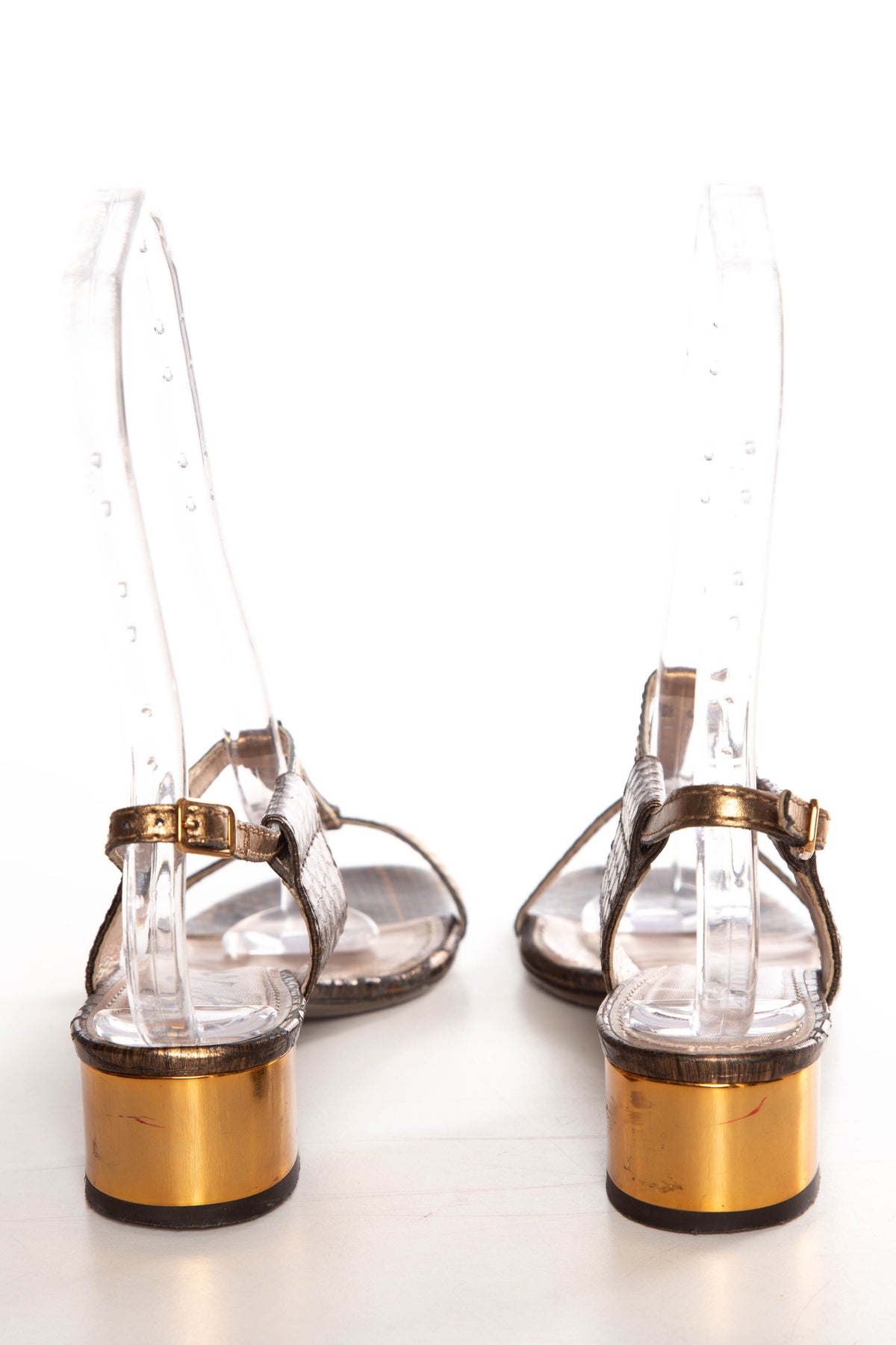 Lanvin bronze python sandals with tonal stitching, leather trim, buckle closure at ankle strap and resin heels.