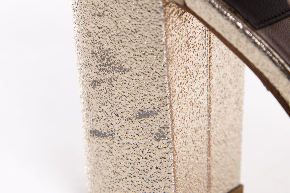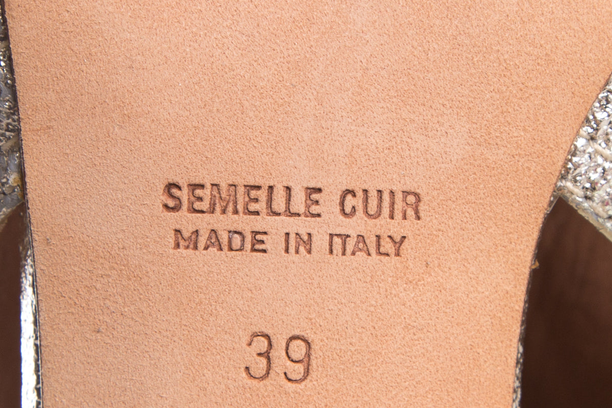 Laurence Dacade Metallic Multi Buckle Heels with open toe. This item is in good condition with slight mark on side of heel.