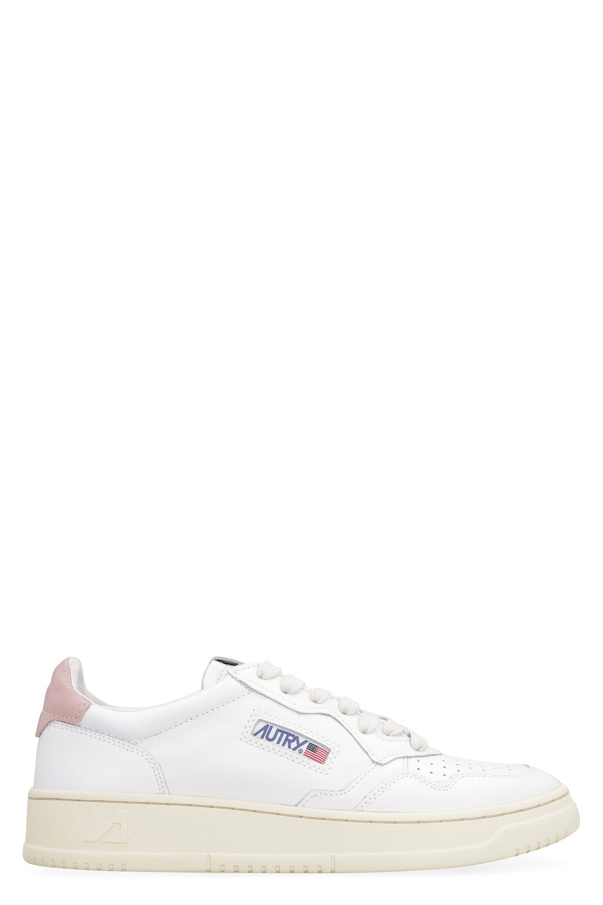 Step up your sneaker game with these white leather low-top sneakers featuring a perforated rounded toe and a pop of pink on the heel with an embossed logo. Complete with a lace closure, logo patch on the tab and side, and a rubber sole, these sneakers are the perfect blend of style and comfort.
