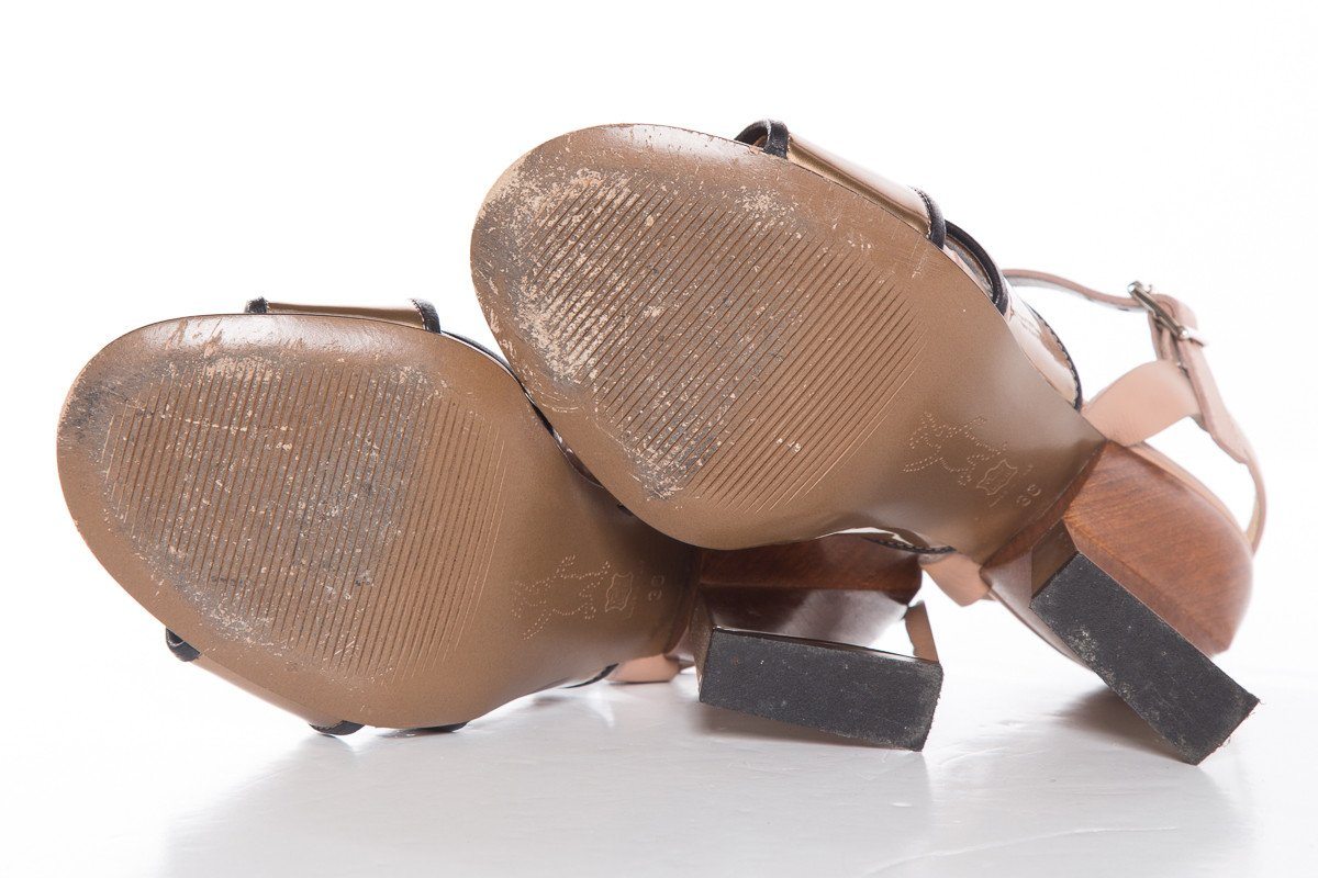 Marni leather sandals with metallic leather trim, tonal stitching, buckle closure and silver resin and wooden block heel