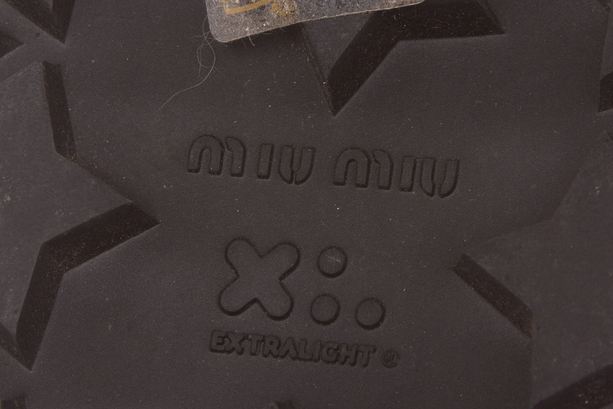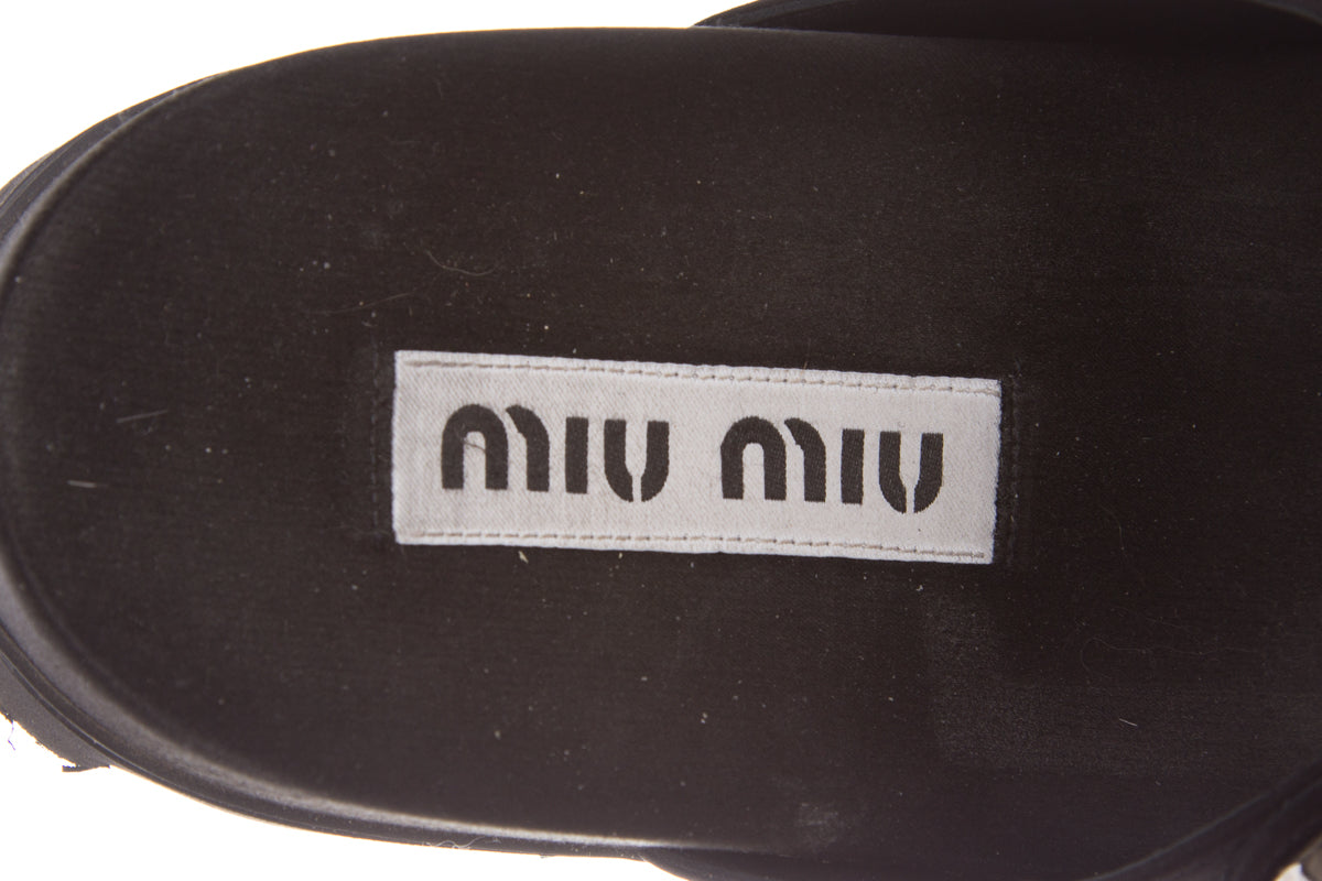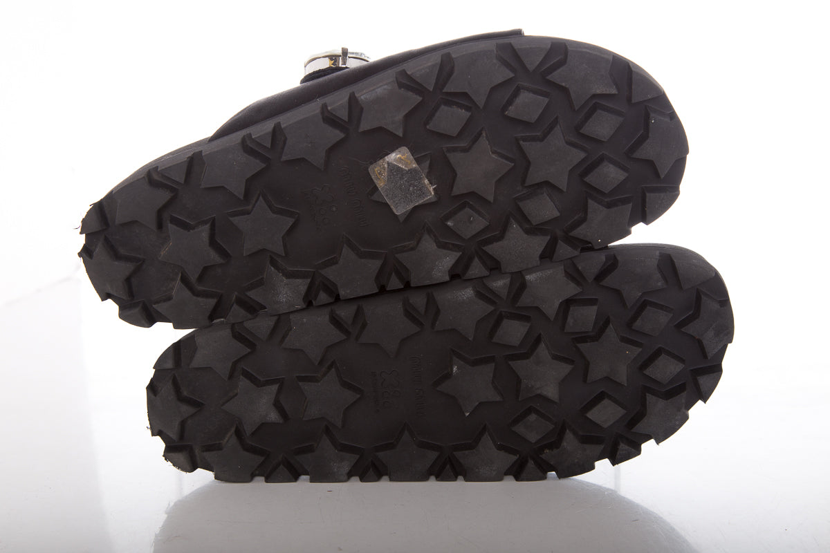 Miu Miu Black Sandals with crystal embellishment. This item is in good condition with some impressions to insoles and some wear to soles.
