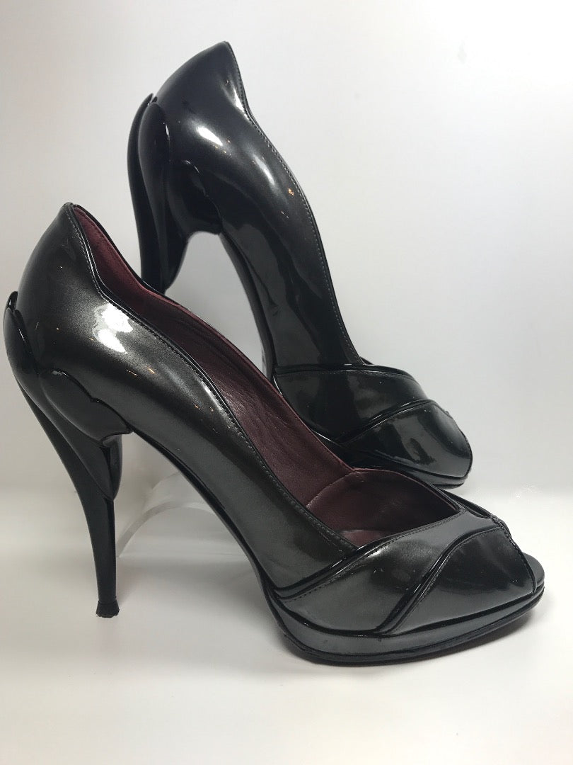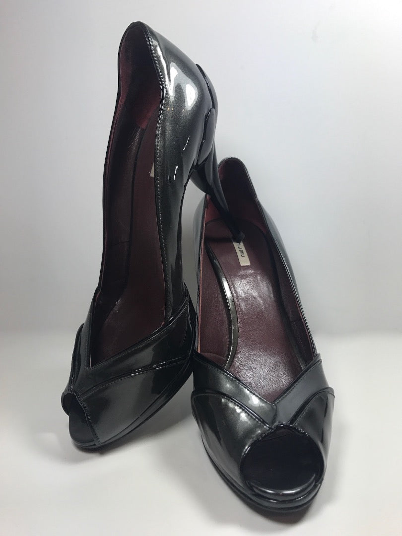 Charcoal Grey and Black Patent Leather Peep Toe Heels Made by Miu Miu. In Good Condition. Plastic part of the heels show some wear (Review Pictures of Details).