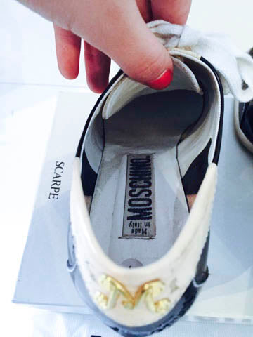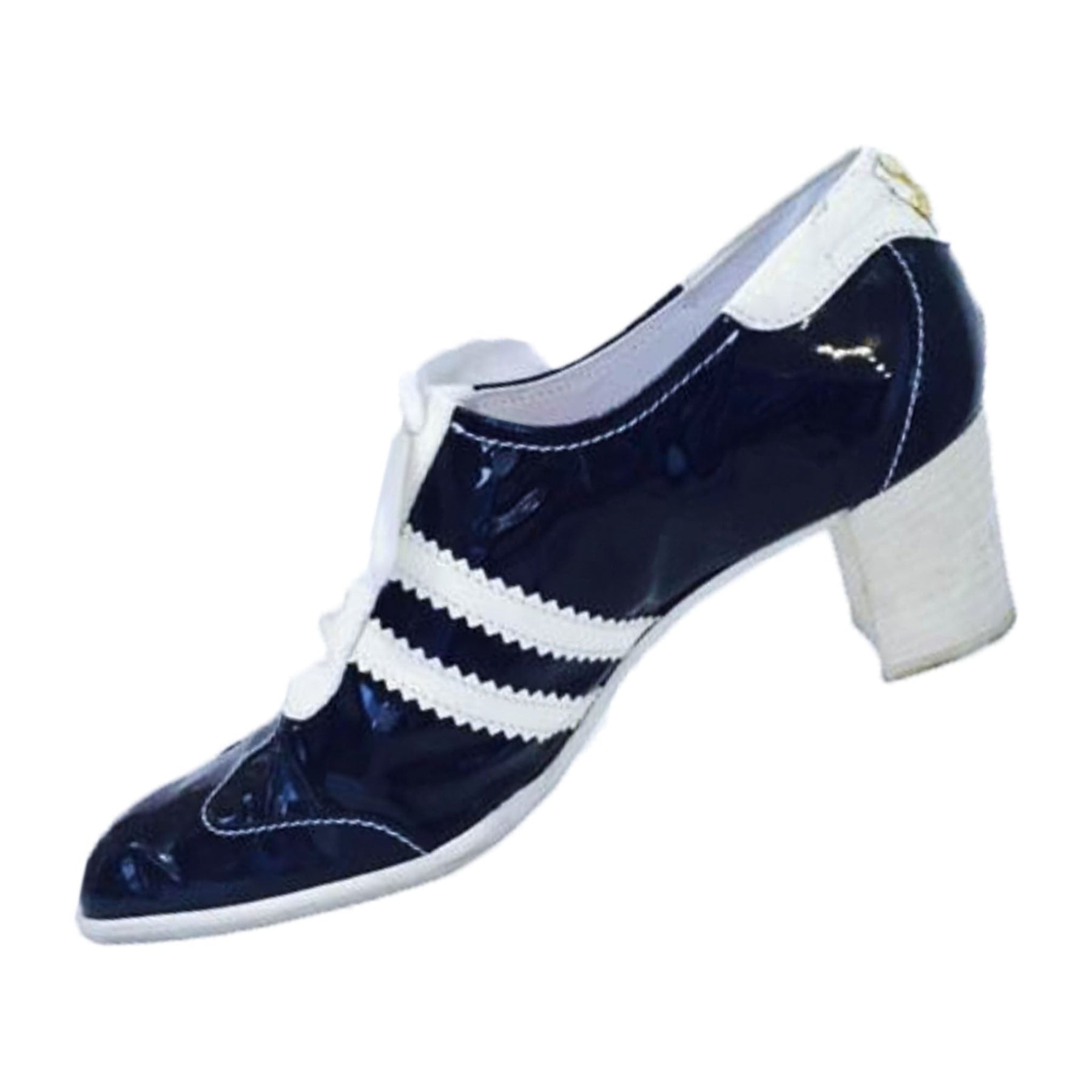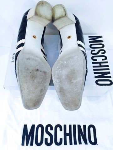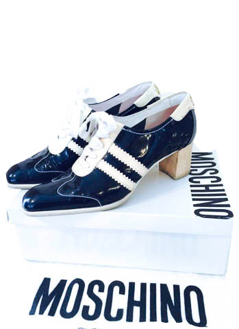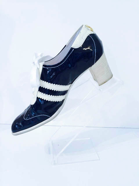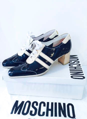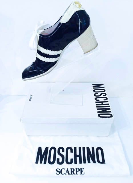 Stylish & sporty black patent leather cream striped lace-up stacked heels by Moschino.