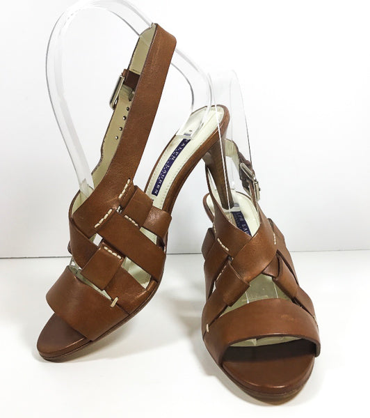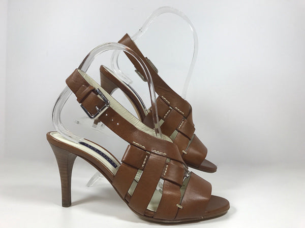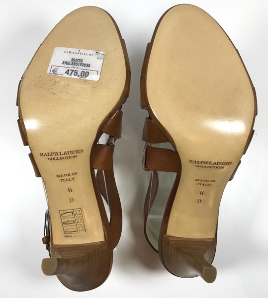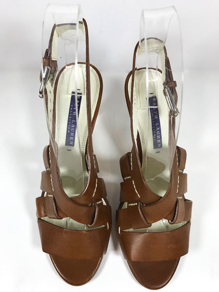 RALPH LAUREN Collection Brown Leather Open Toe Slingback Sandals with 3 Inch Heel