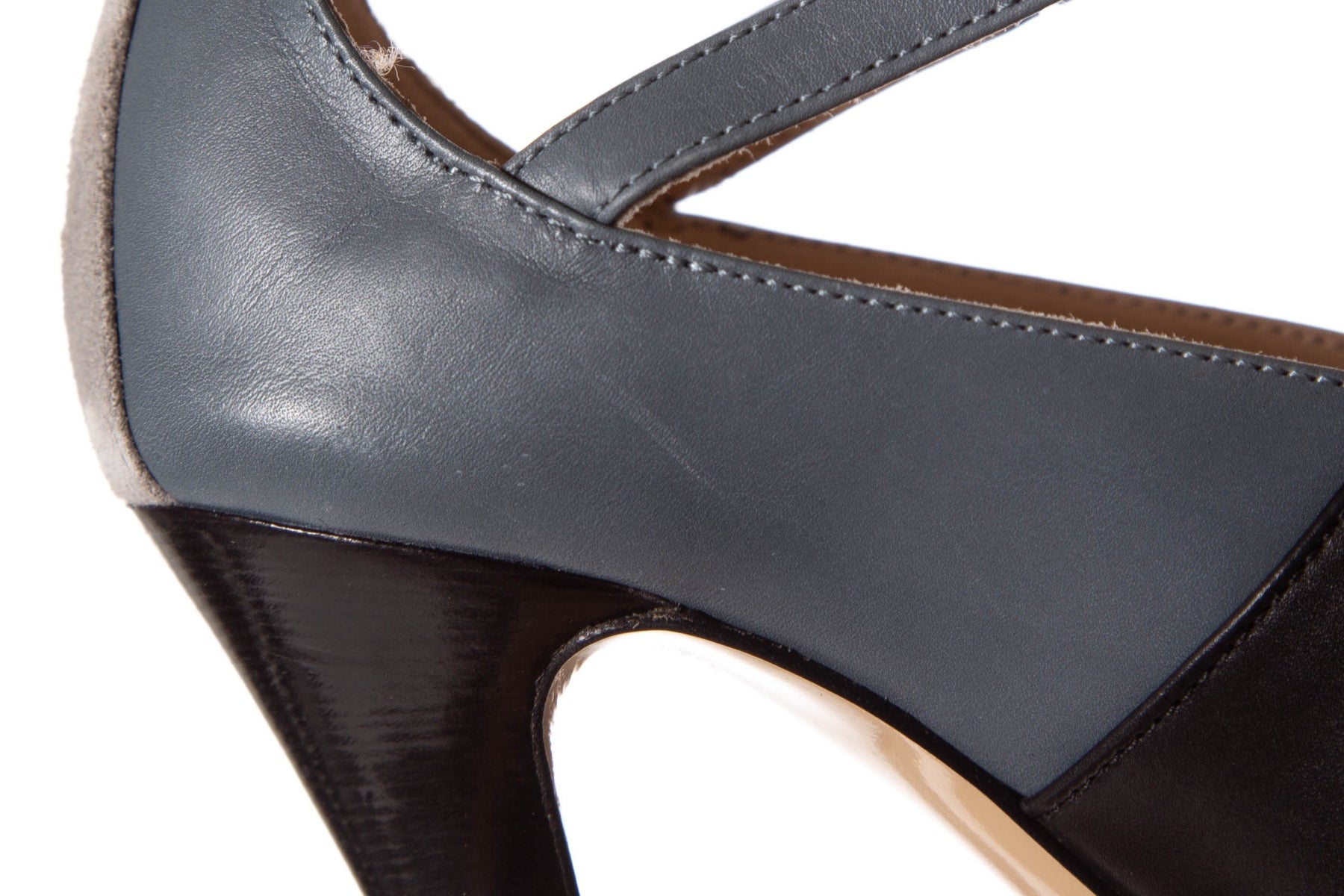 Ruthie Davis color-blocked, peep-toe platform pumps with tonal stitching, buckle closure at ankle strap and stacked heels.