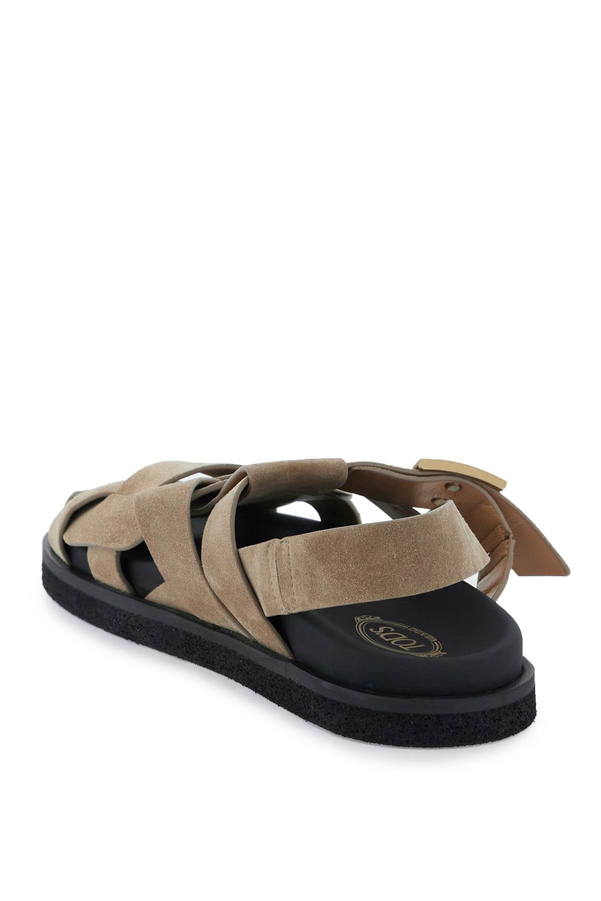 Indulge in luxury with these exquisite suede sandals by Tod's. The crisscross bands are embellished with the branded gold metal T Timeless accessory, adding a touch of sophistication to your look. The leather footbed and light rubber sole ensure both comfort and style, making these sandals a must-have for any fashion enthusiast.