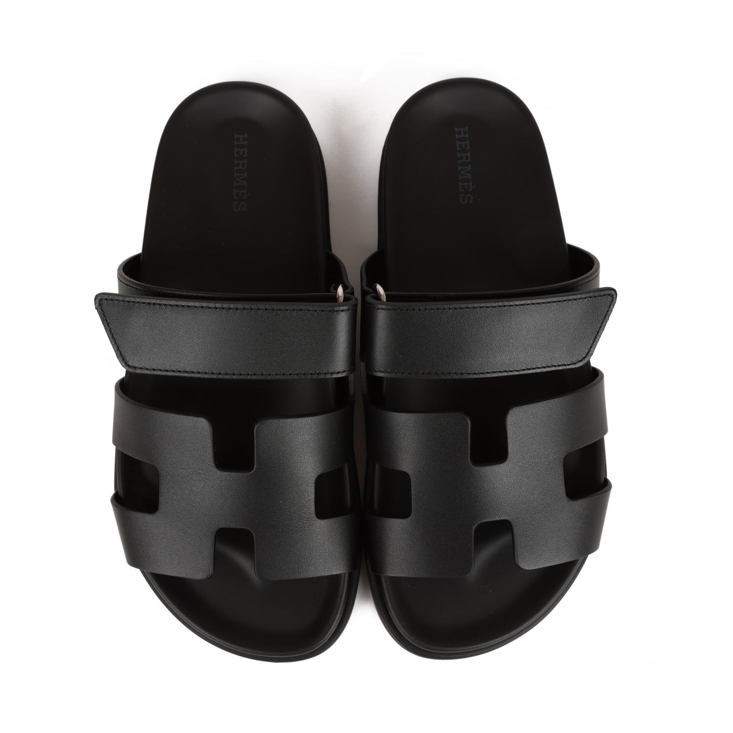 This pair of Cypre sandals are in black calfskin and feature the iconic H and a velcro crossover strap.