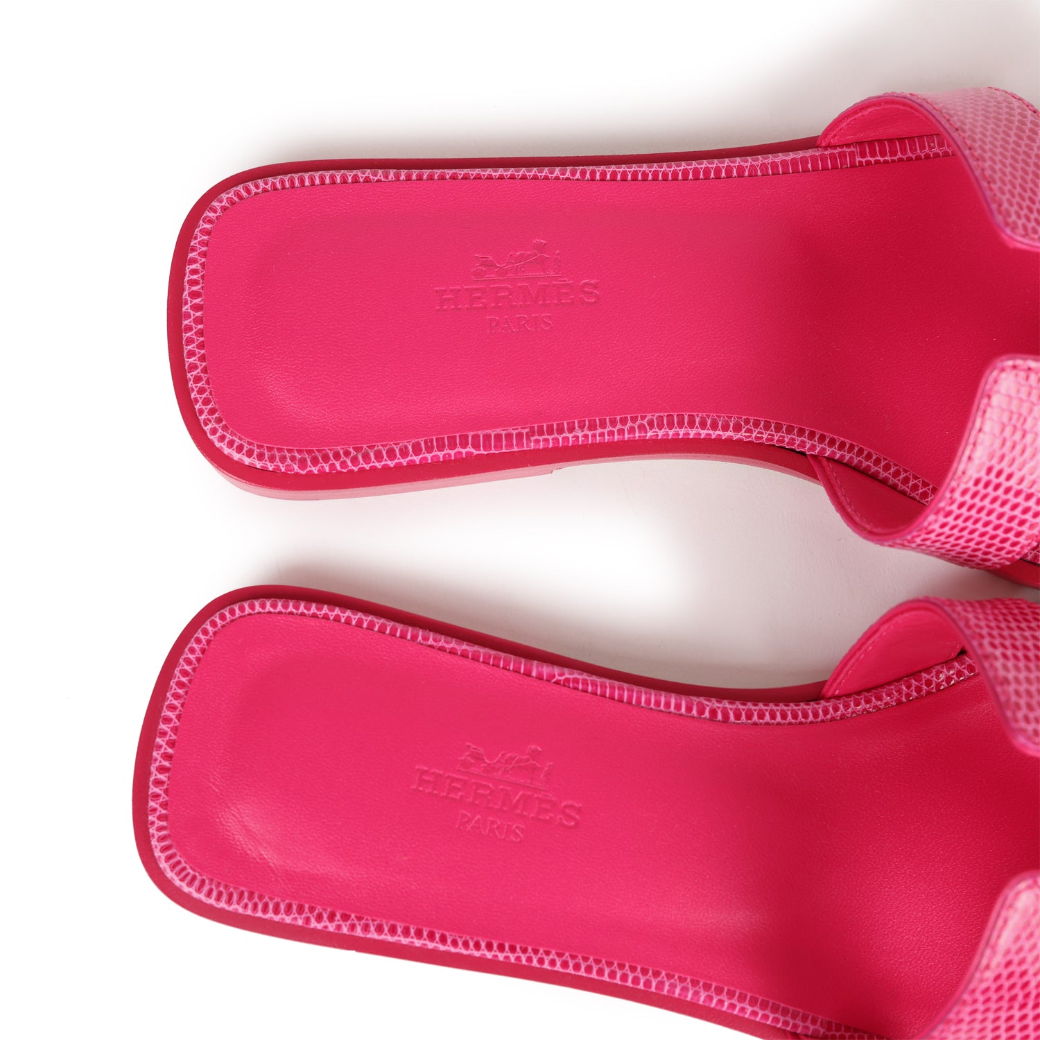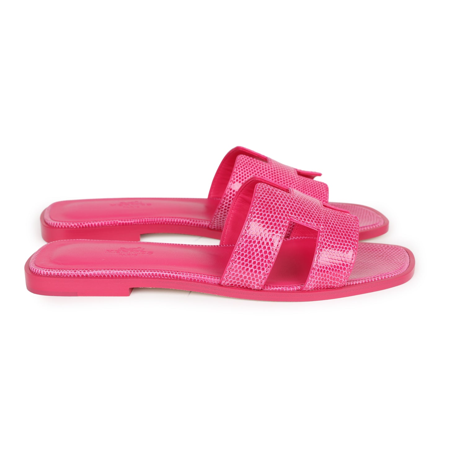 This pair of Oran sandals are in Rose Flash Lizard with natural leather sole and heel