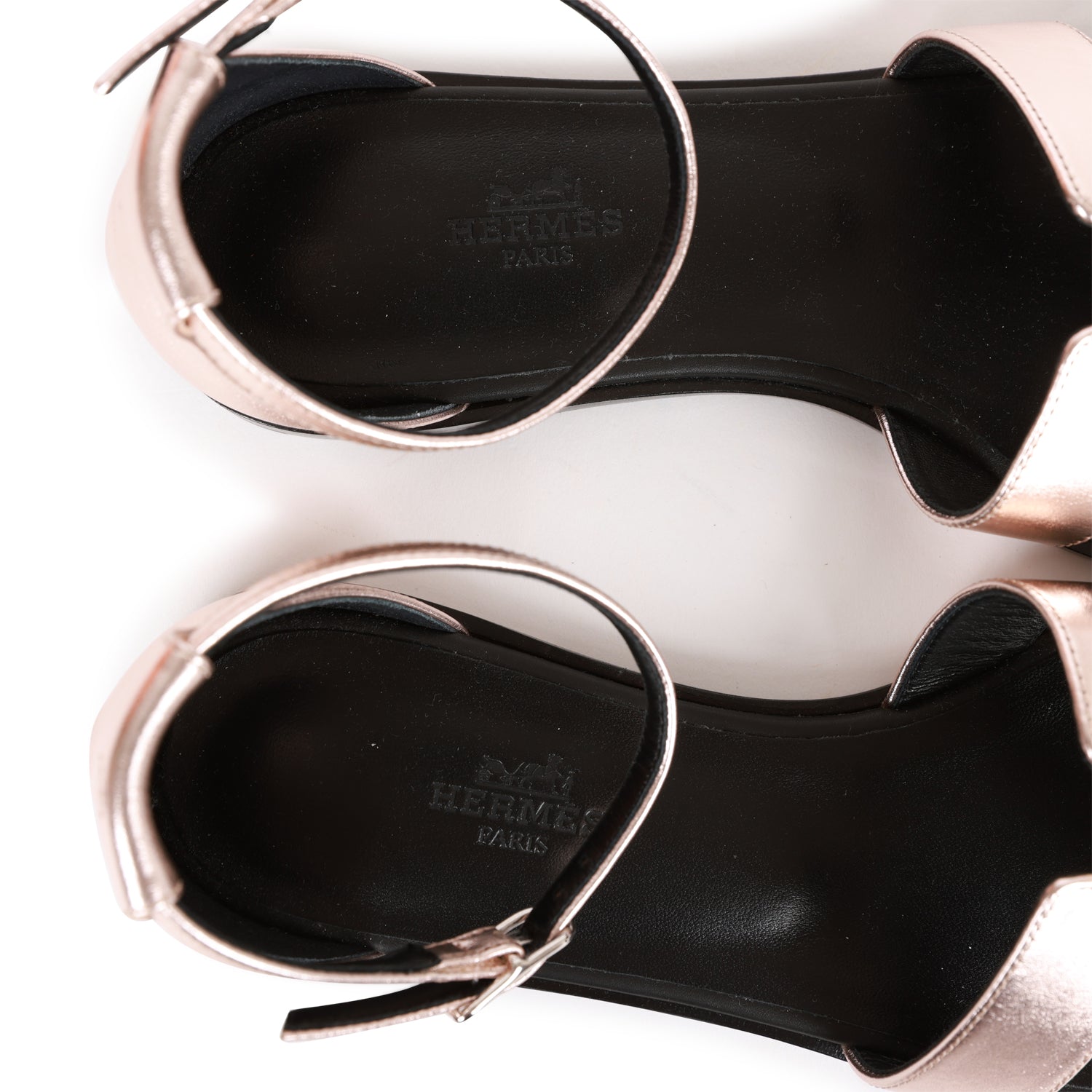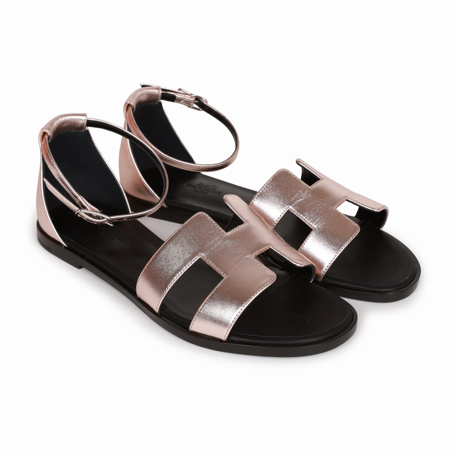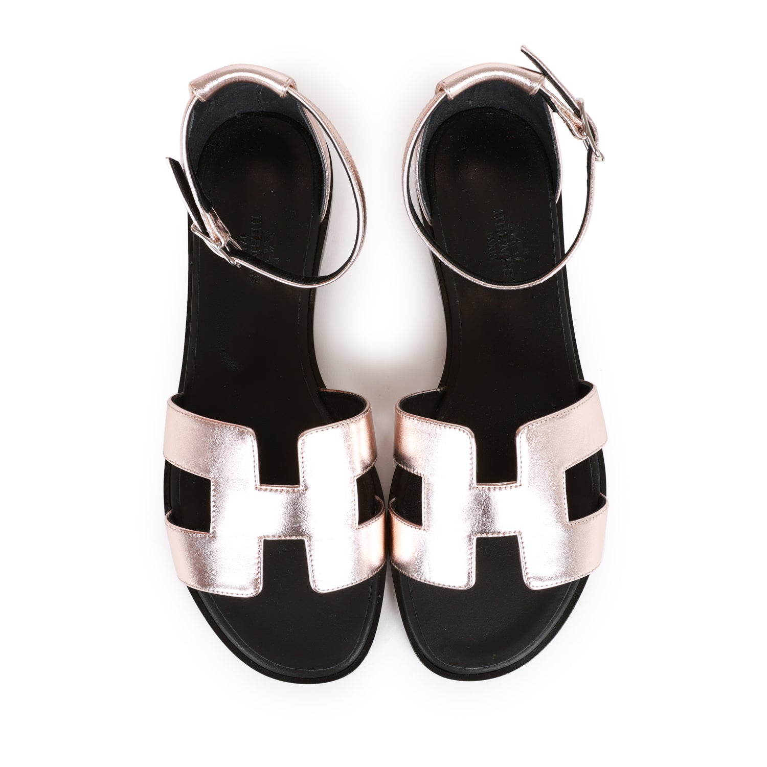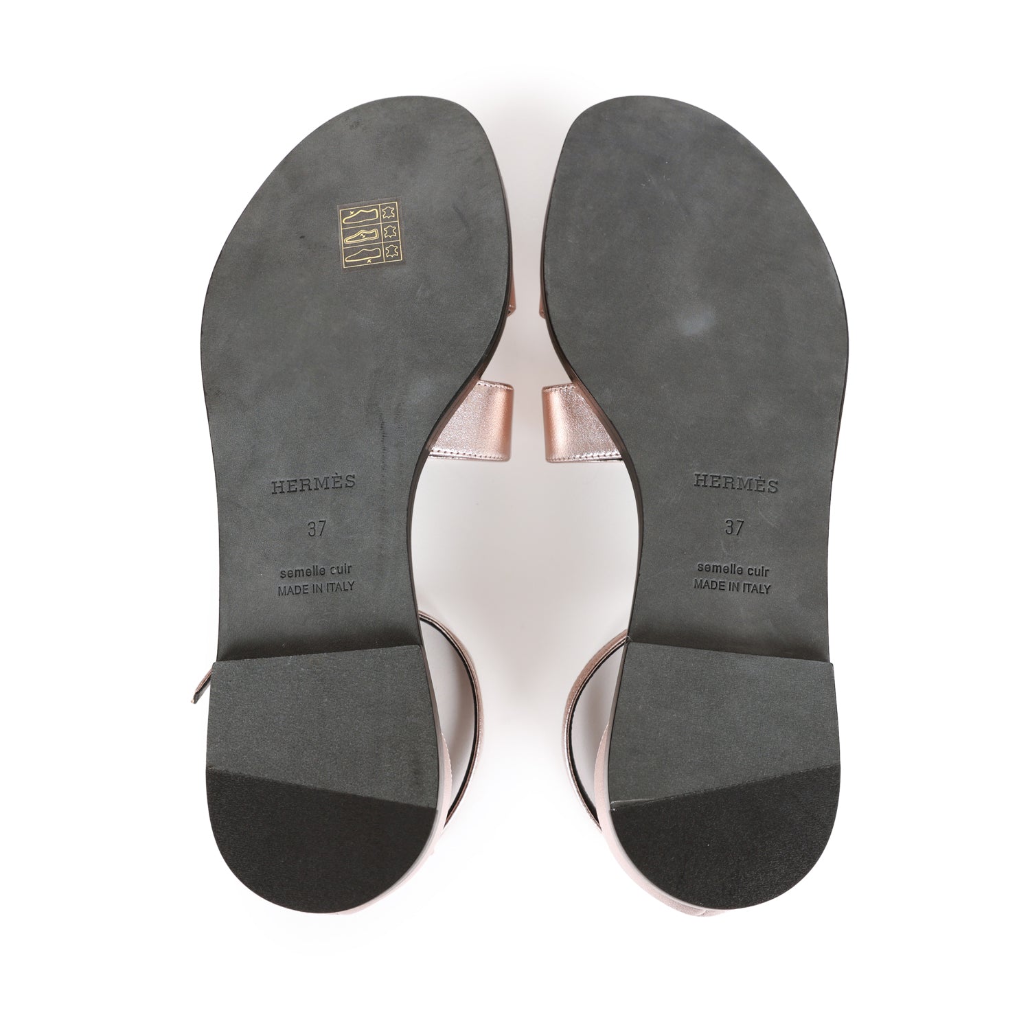 This pair of Hermes Santorini sandals are in metallic pink, featuring the iconic H and a ankle strap with a natural leather sole.
