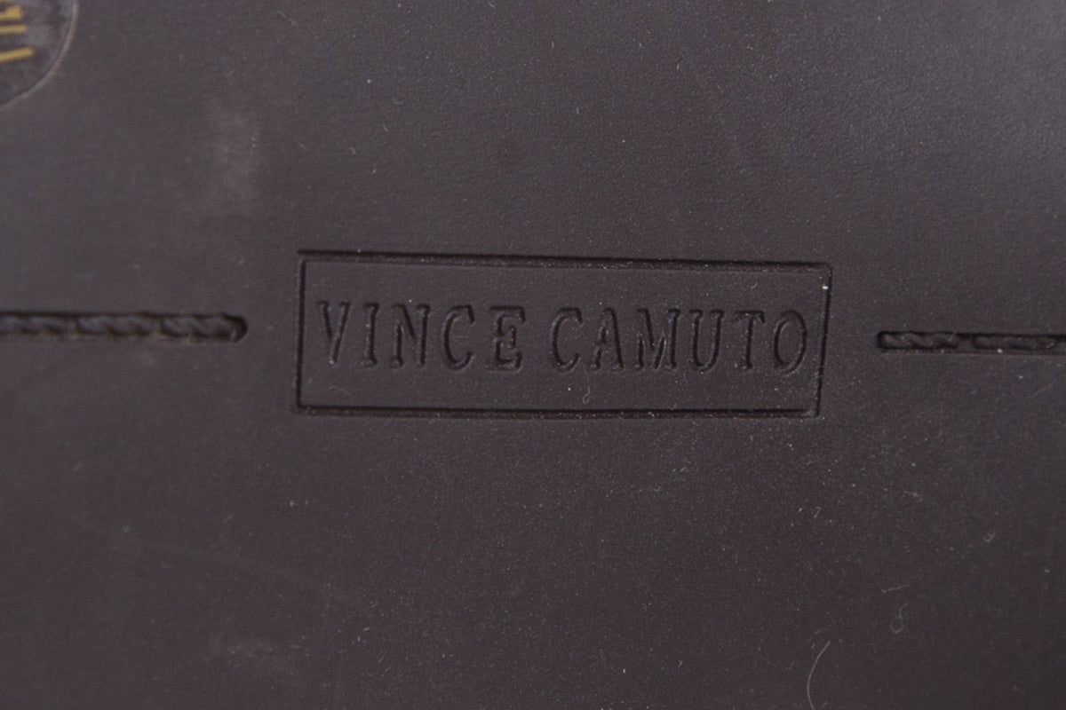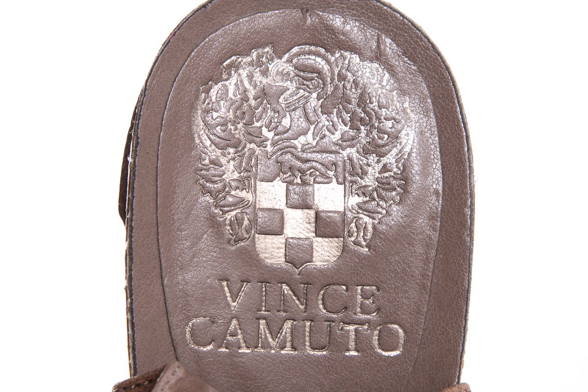 Vince Camuto Peep Toe Leather Taupe Heels with velcro ankle strap for closure. This item is in good condition with some wear to soles and to back of heel.