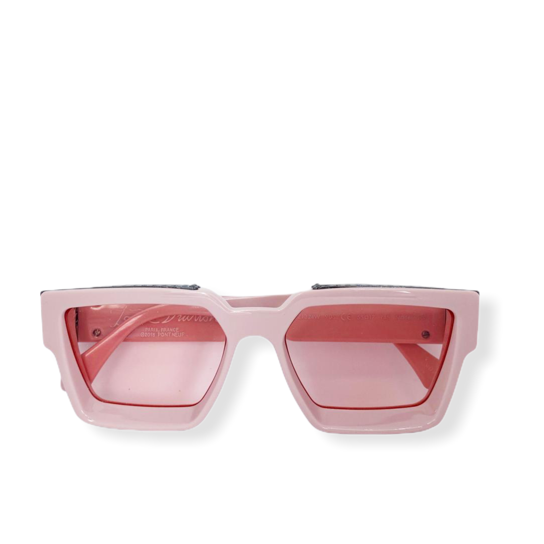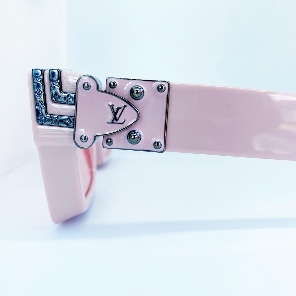 The bold shape of Louis Vuitton's Millionaires frame gets feminine for SS20 in a beautiful pastel pink hue. LV initials sit on the temple of the frame with monogram metal inserts on the top bar.