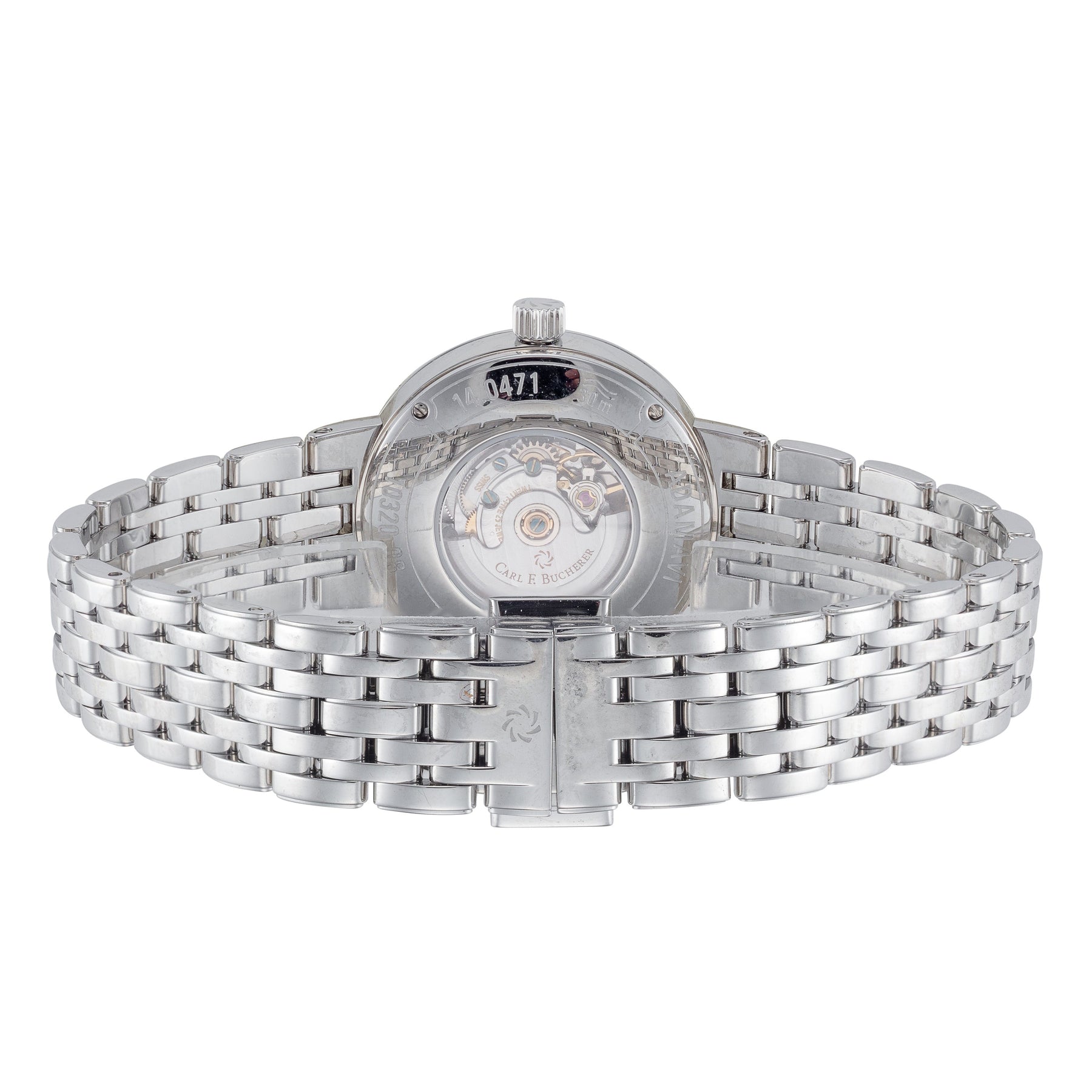 Collection Name: Adamavi, Gender: Women's, Case Shape: Round, Case Material: Stainless Steel, Case Back: Exhibition, Case Width (mm): 31, Case Thickness (mm): , Case Crystal: Sapphire Crystal Scratch Resistant, Case Water Resistance: 30 m (100 feet), Dial Color: Silver, Band Type: Bracelet, Band Material: Stainless Steel, Band Color: Silver, Band Length (in.): , Band Size Width (mm): , Band Clasp: Deployment Clasp, Features: Date, Movement Type: Automatic, Movement Caliber: CFB 1963, Movement Crown: Pull and Push Crown, Country of Origin: Made in Switzerland,