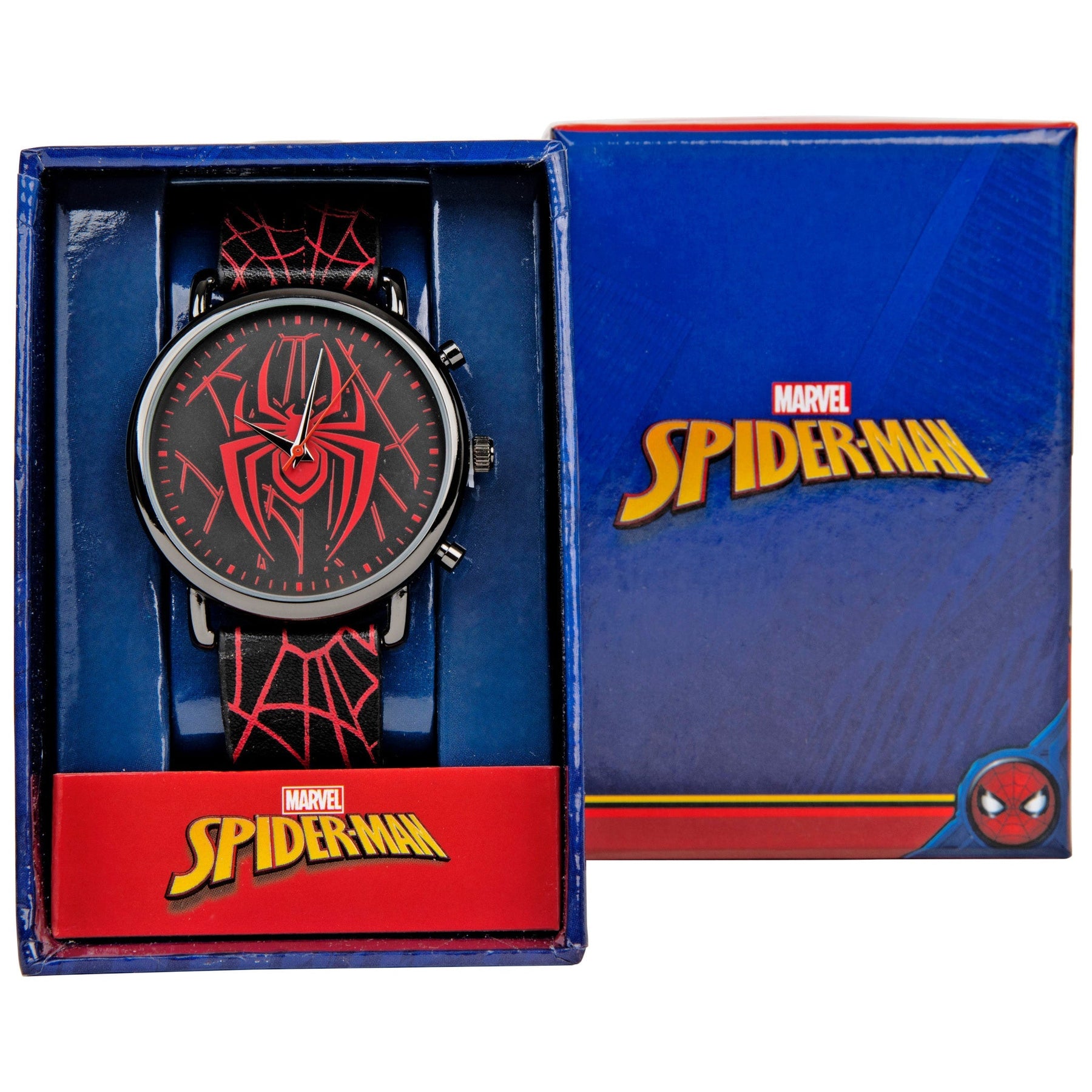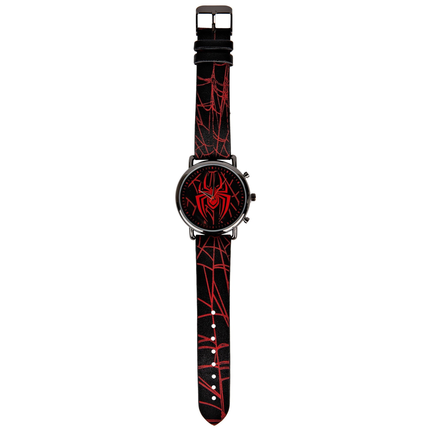 Stick to your schedule like a fly sticks to the spider's web with this officially licensed Spider-Man Symbol and Webbing Watch with Faux Leather Strap. Featuring a super snazzy Spider-Man symbol & Webbing design, this epic black and red Marvel wristwatch is made from metal and comes with a faux leather strap.