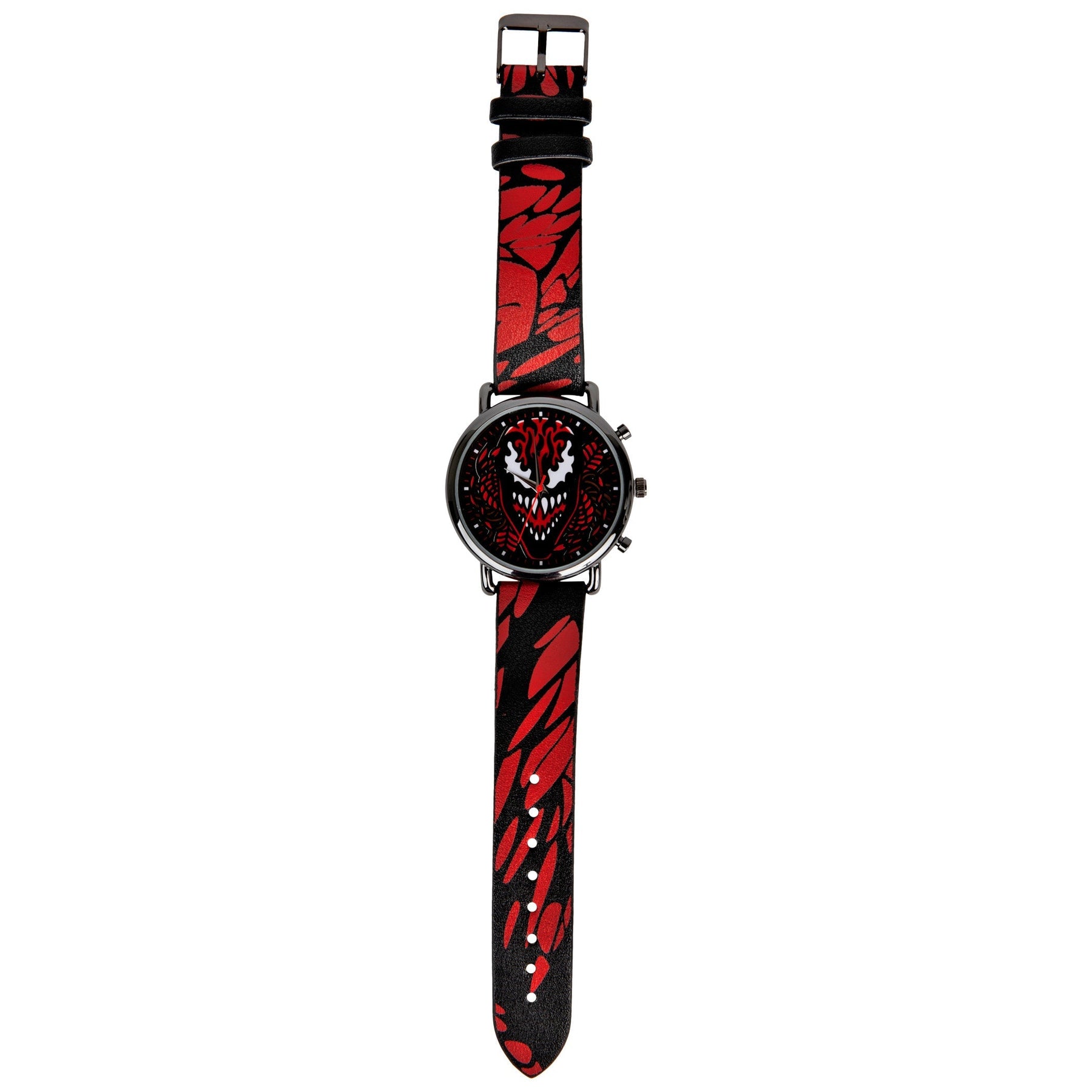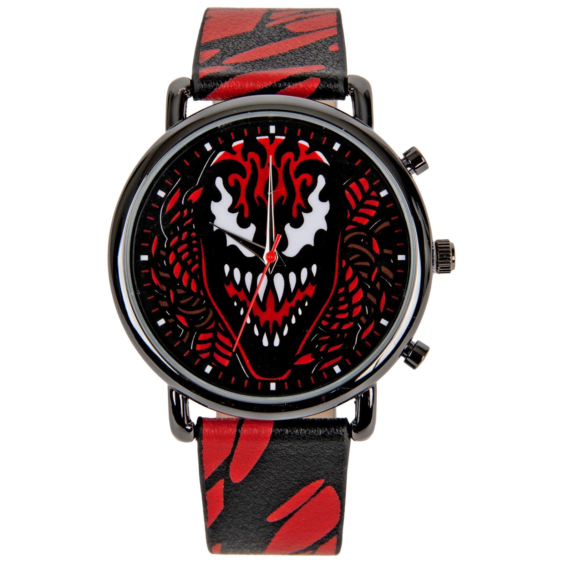 Contain the chaos and carnage of your busy day to a strict and structured schedule with the help of this officially licensed Carnage Face and Symbiote Watch with Faux Leather Strap. Featuring a cool Carnage Face Symbol design, this epic black and red Marvel wristwatch is made from metal and comes with a faux leather strap.