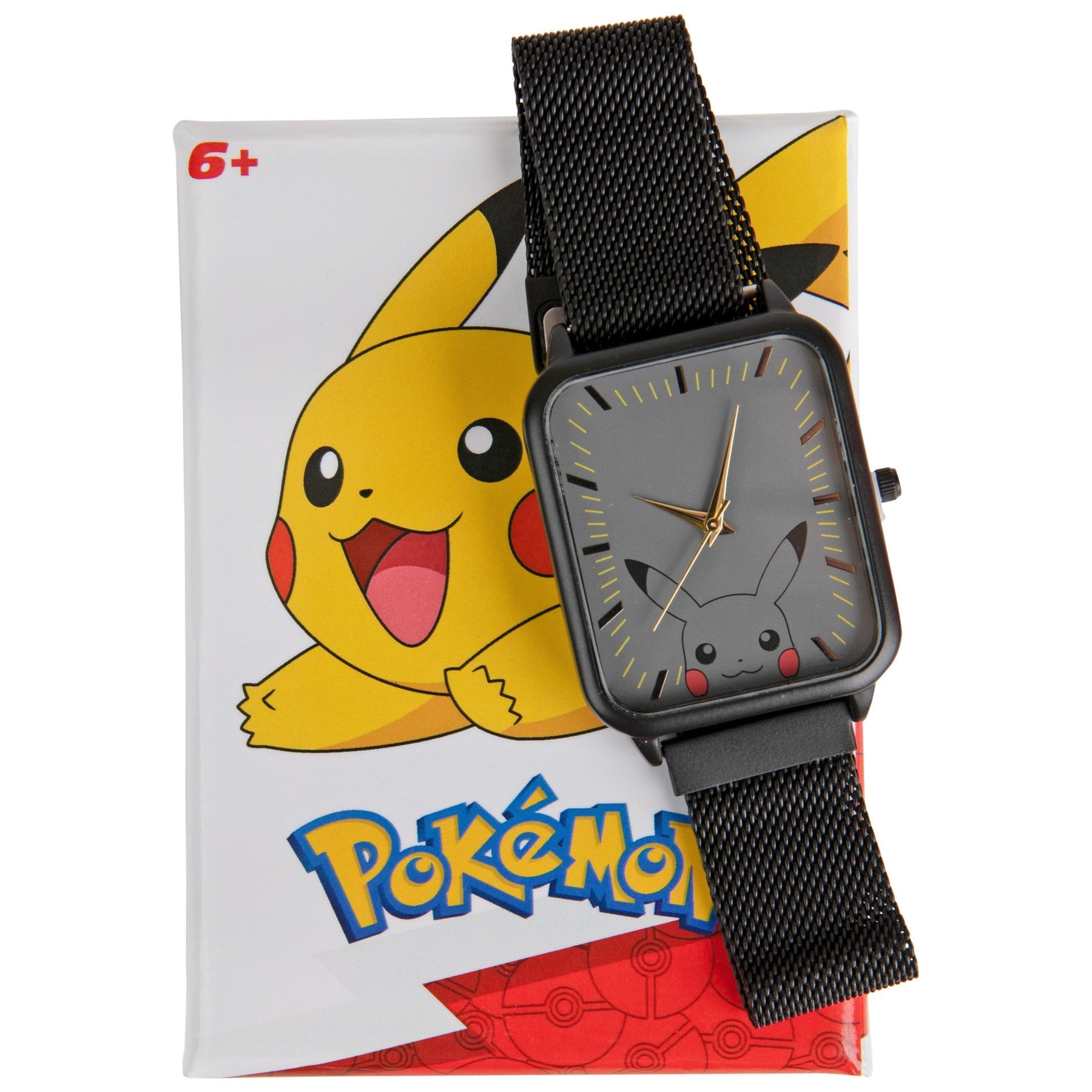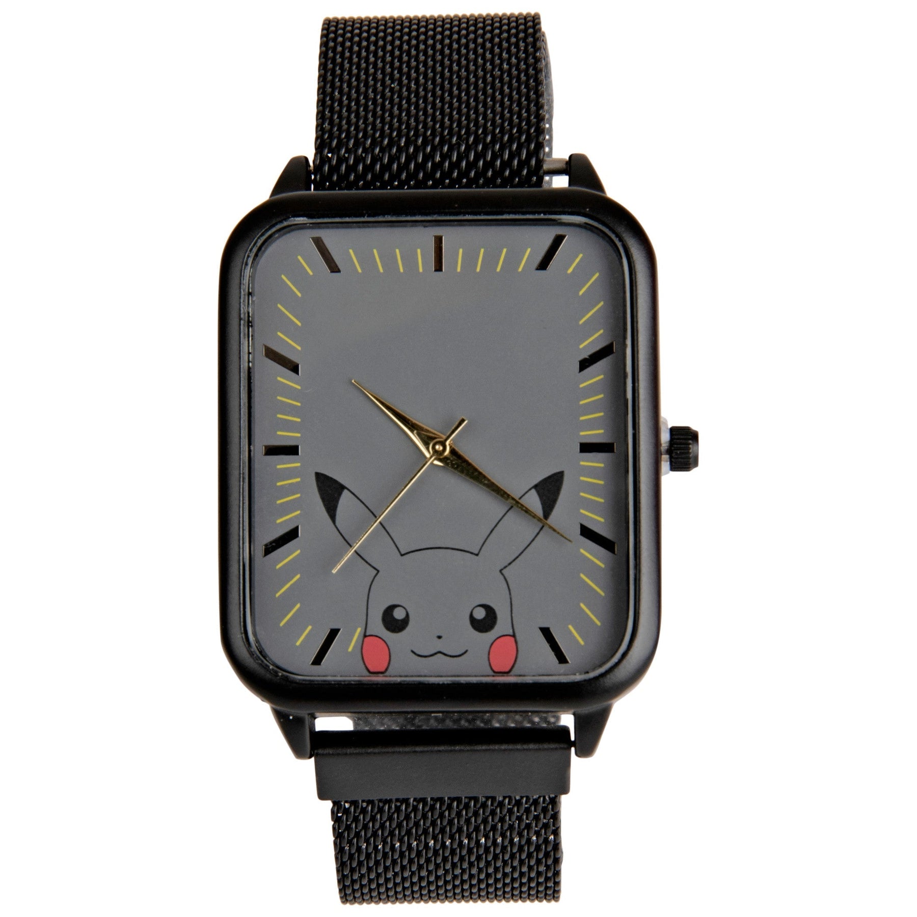 Transcend trendy when you tell the time with this officially licensed Pokemon Cute Pikachu Square Watch Face w/ Mesh Band. This sleek black and grey Pokemon Watch features a snazzy square face that features a cute Pikachu character design with a black mesh wristband.