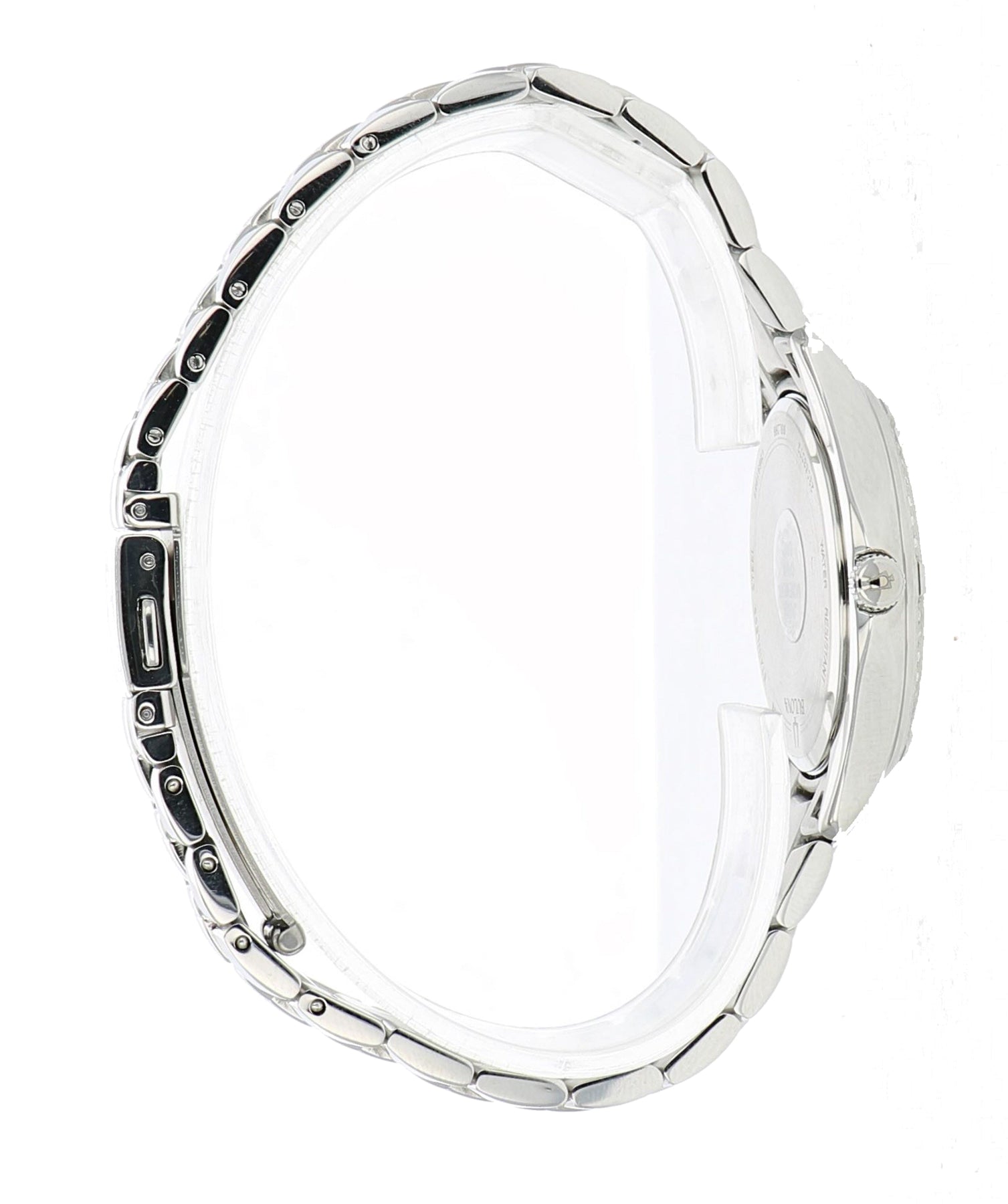 Collection Name: Classic, Case Shape: Round, Case Material: Stainless Steel, Case Width (mm): 35, Case Crystal: Mineral Crystal, Case Water Resistance: 30 m (100 feet), Dial Color: Black Mother-of-Pearl, Band Type: Bracelet, Band Material: Stainless Steel, Band Color: Silver, Band Clasp: Deployment Clasp, Movement Type: Quartz, Country of Origin: Made in Japan