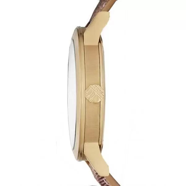 Brown Check Patterned Leather Strap with Yellow Gold PVD Plated Stainless Steel Pin Buckle.