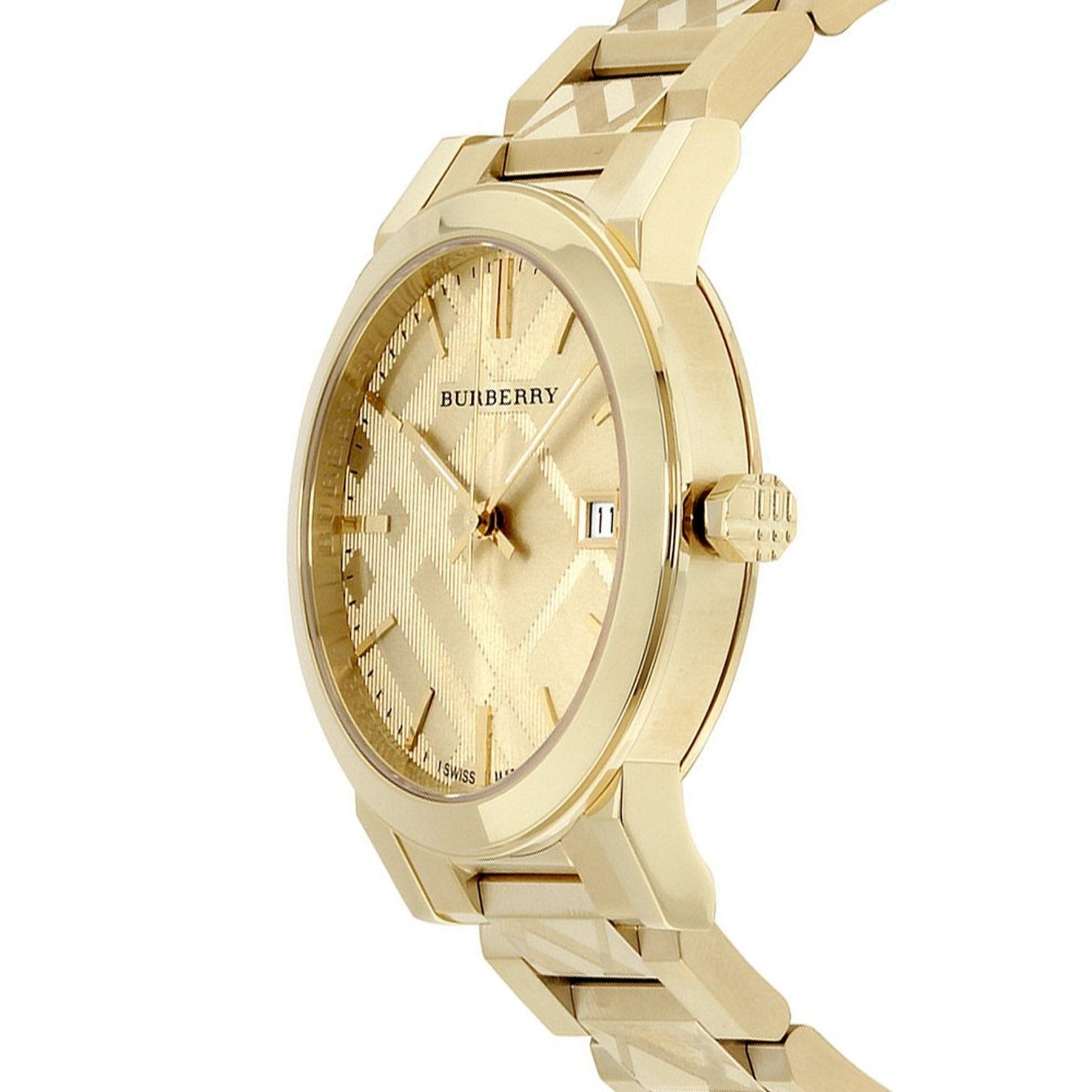 Gold Textured Dial. Luminous Stainless Steel Hands and Stick Indexes. Date Window at 3.