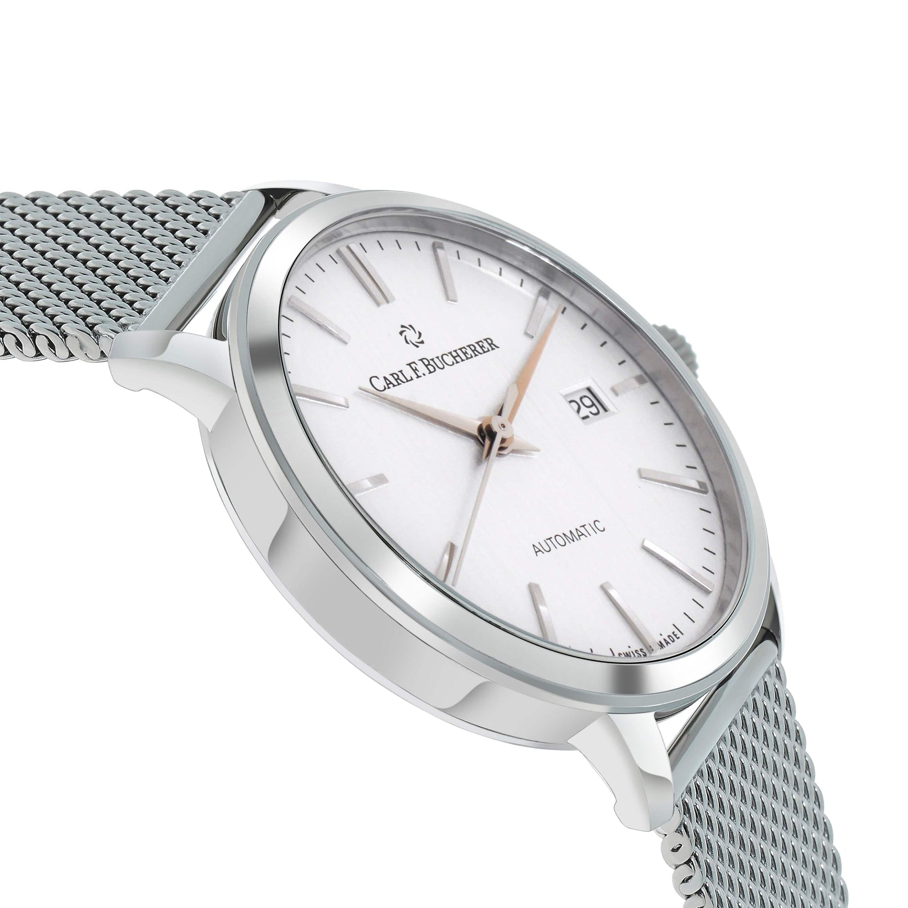 Carl F. Bucherer Adamavi, with its elegant 31mm stainless steel case, is seamlessly integrated into a stainless steel bracelet, secured by a deployant clasp. The silver dial, enhanced with a date display, is powered by the precision of the CFB 1963 movement, visible through the scratch-resistant sapphire crystal.