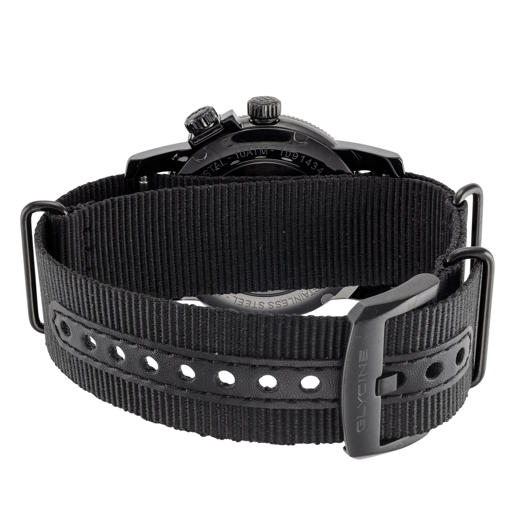 Fabric Band, Stainless Steel/ Sapphire Crystal Scratch Resistant Case, 10 in. band length, 22 mm band width, 42 mm case width, 12.18mm case thickness, Airman Contemporary Collection, Round Shape, Pin Buckle Strap Band, Automatic Movement, 100 m (330 feet) Water Resistant, Made in Switzerland