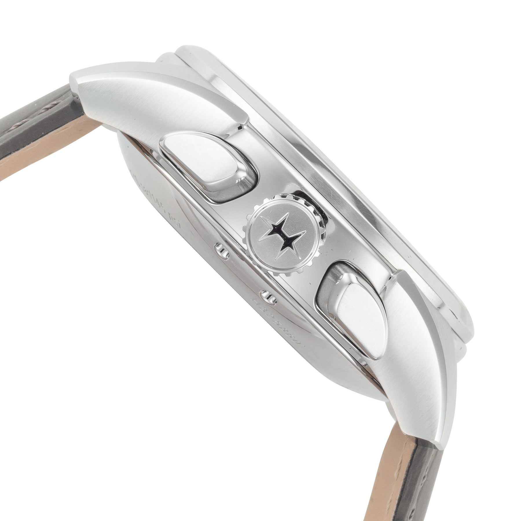 Collection Name: Jazzmaster, Gender: Men's, Case Shape: Round, Case Material: Stainless Steel, Case Back: Exhibition, Case Width (mm): 42, Case Thickness (mm): 15.23, Case Crystal: Sapphire Crystal Scratch Resistant, Case Water Resistance: 100 m (330 feet), Dial Color: Grey, Band Type: Strap, Band Material: Leather, Band Color: Grey, Band Length (in.): 8, Band Size Width (mm): 22, Band Clasp: Pin Buckle, Features: Chronograph, Movement Type: Automatic, Movement Caliber: H-21, Movement Crown: Pull and Push Crown, Country of Origin: Made in Switzerland,