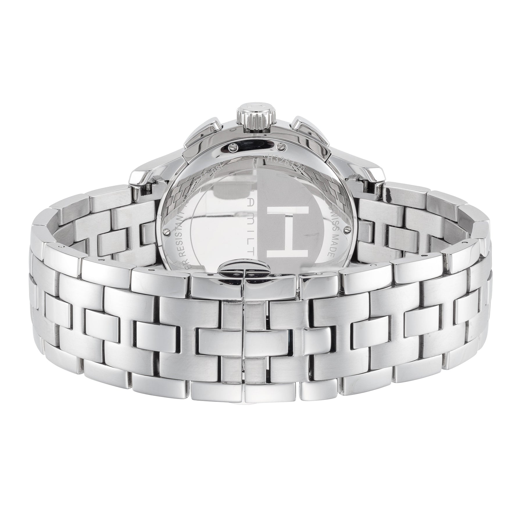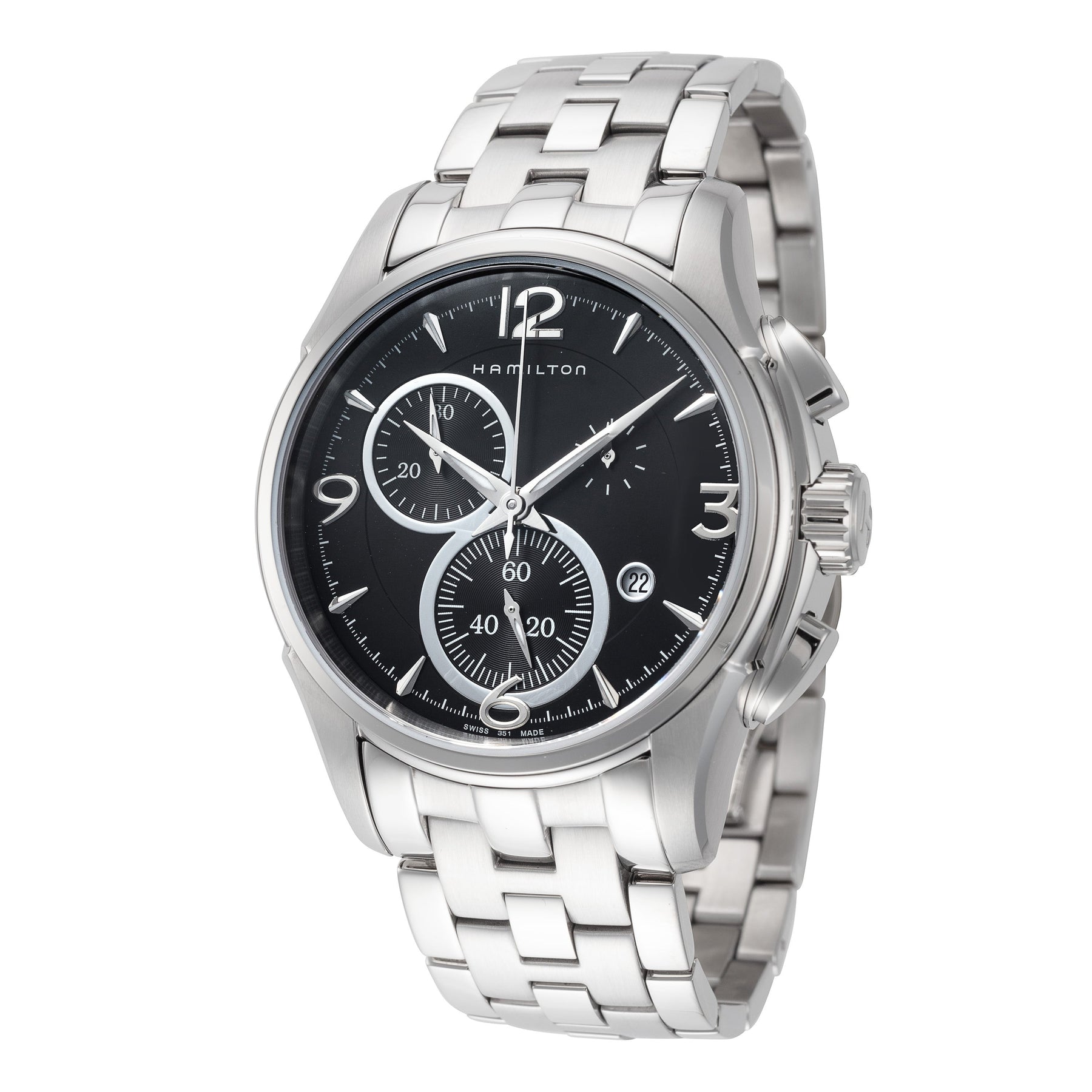 Stainless Steel Band, Stainless Steel/ Sapphire Crystal Scratch Resistant Case, 8.5 in. band length, 22 mm band width, 42 mm case width, 11mm case thickness, Jazzmaster Collection, Round Shape, Deployment Clasp Bracelet Band, Quartz Movement, 100 m (330 feet) Water Resistant, Made in Switzerland