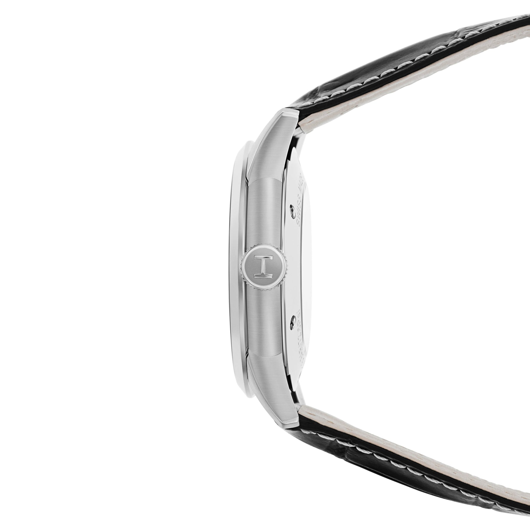 Leather Band, Stainless Steel/ Sapphire Crystal Scratch Resistant Case, 7 in. band length, 19 mm band width, 40 mm case width, 12mm case thickness, American Classic RailRoad Collection, Round Shape, Fold-Over Clasp with Push Button Strap Band, Automatic Movement, 50 m (165 feet) Water Resistant, Made in Switzerland