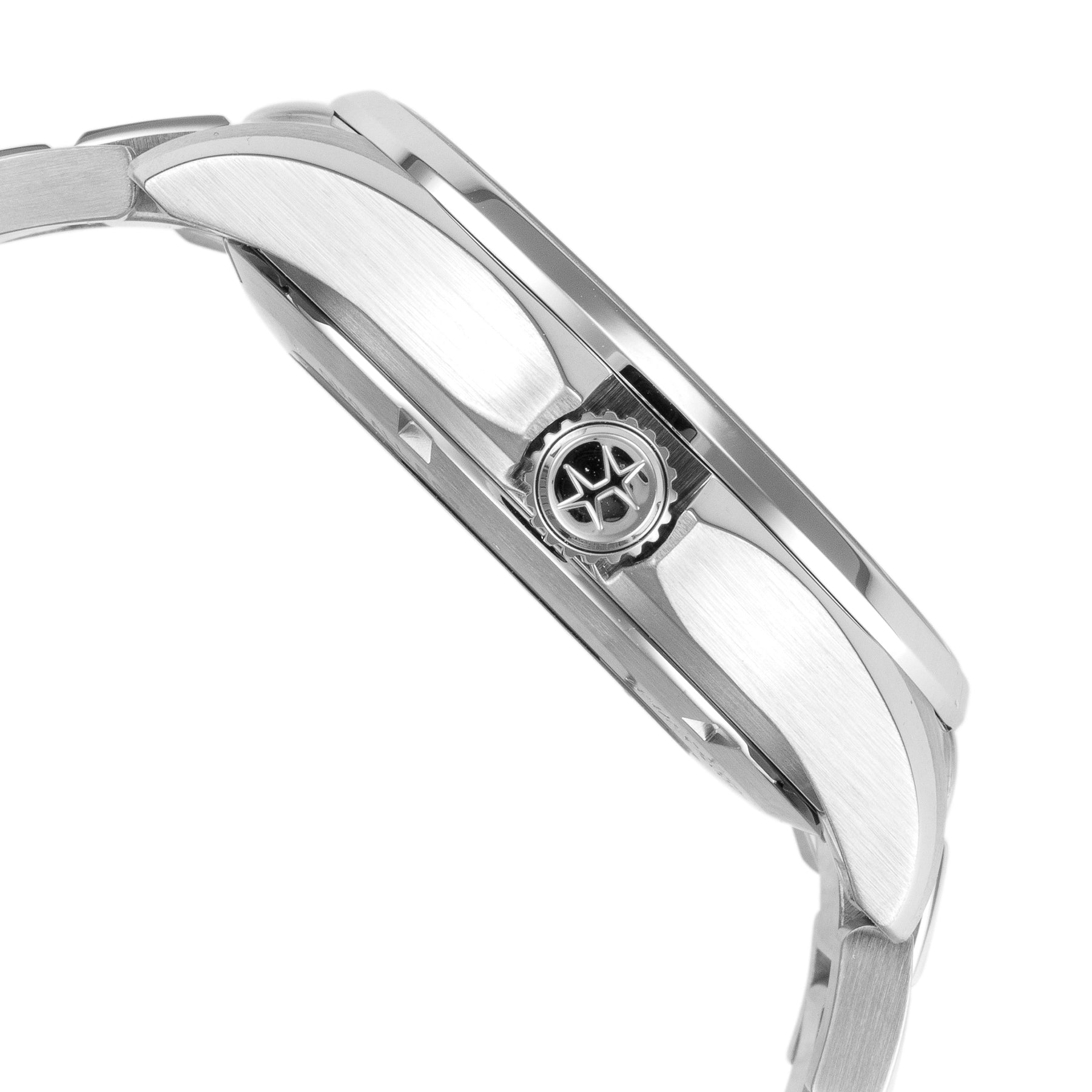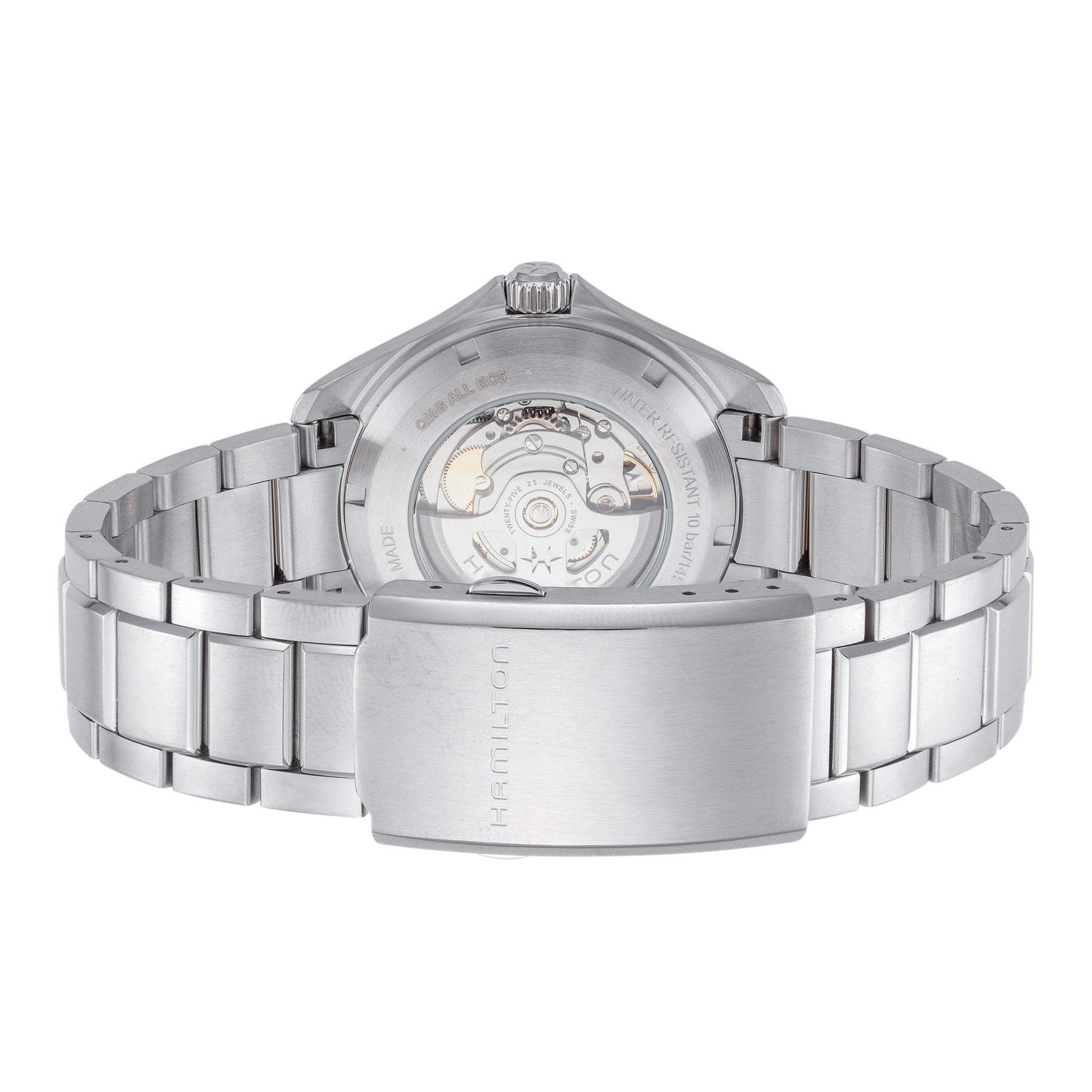 Collection Name: Khaki Aviation, Case Shape: Round, Case Material: Stainless Steel, Case Width (mm): 42, Case Crystal: Sapphire Crystal Scratch Resistant, Case Water Resistance: 100 m (330 feet), Dial Color: Black, Band Type: Bracelet, Band Material: Stainless Steel, Band Color: Silver, Band Clasp: Deployment Clasp, Movement Type: Automatic, Country of Origin: Made in Switzerland