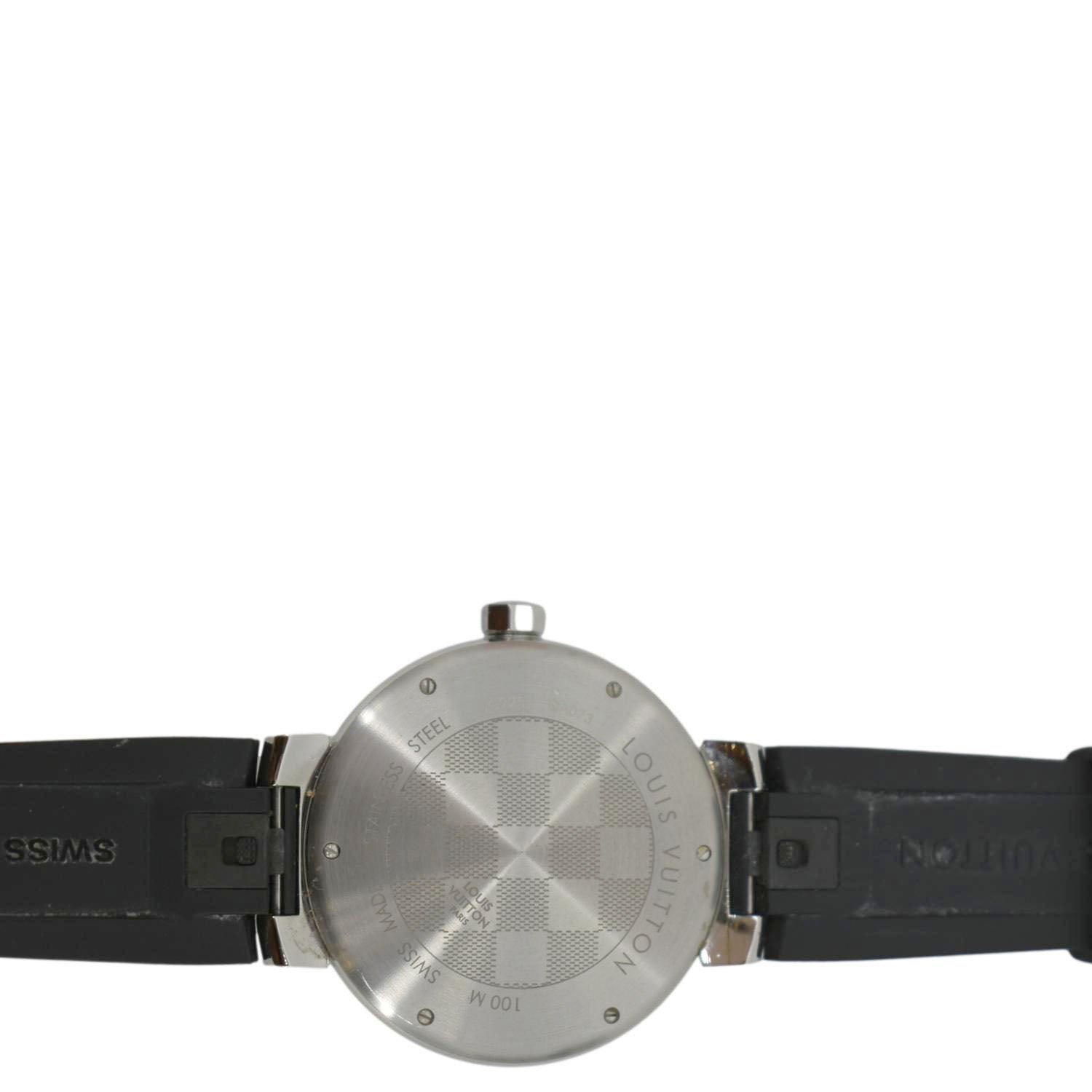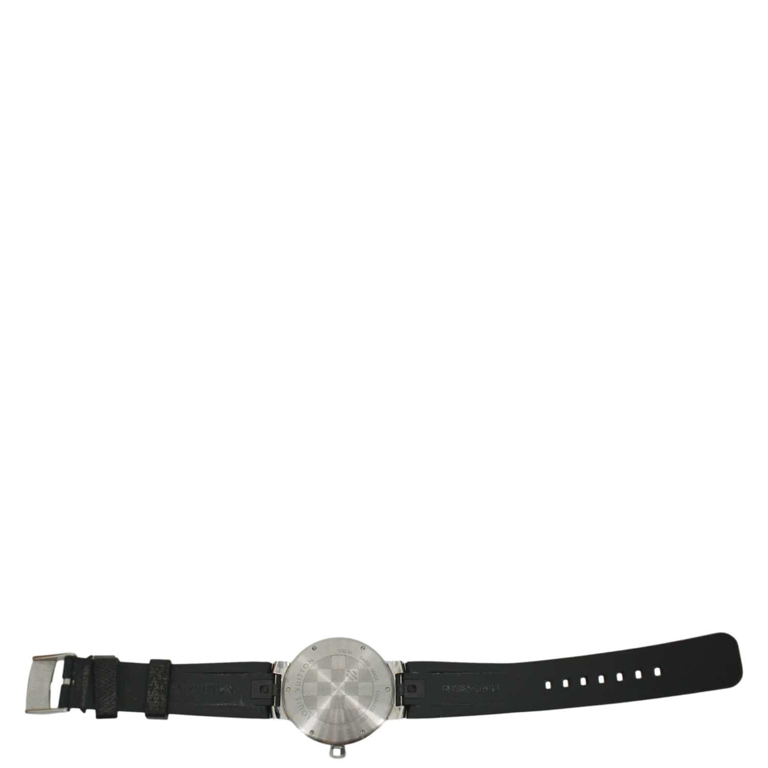 The Tambour watch is unique and inspired by the iconic Damier Graphite canvas. As a result of a clever alliance between two icons, the Tambour case and the Damier Graphite canvas of leather goods, the Tambour Damier Graphite stands out as the emblematic masculine watch of Louis Vuitton.