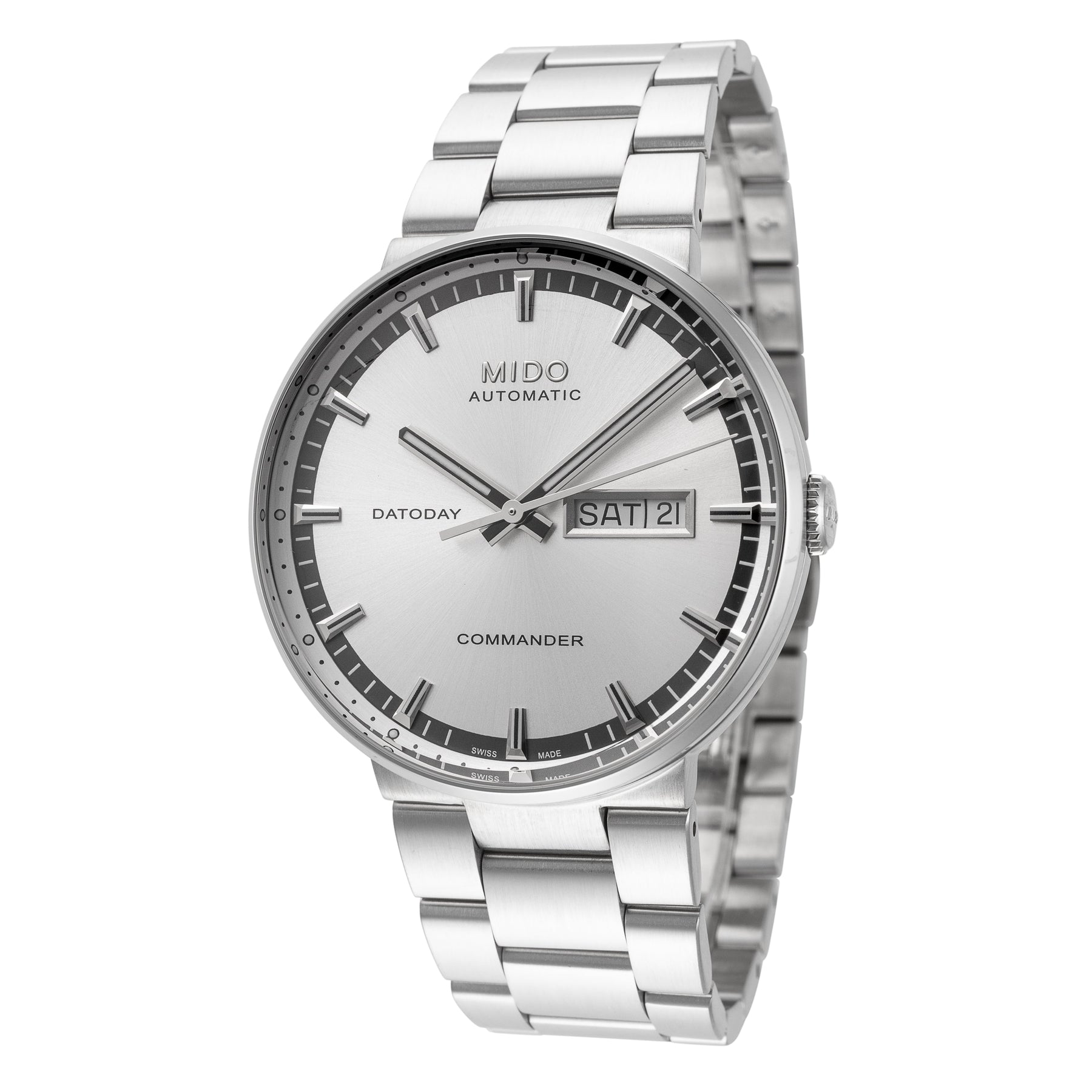 Collection Name: Commander, Case Shape: Round, Case Material: Stainless Steel, Case Width (mm): 40, Case Crystal: Sapphire Crystal Scratch Resistant, Case Water Resistance: 50 m (165 feet), Dial Color: Silver, Band Type: Bracelet, Band Material: Stainless Steel, Band Color: Silver, Band Clasp: Deployment Clasp, Movement Type: Automatic, Country of Origin: Made in Switzerland