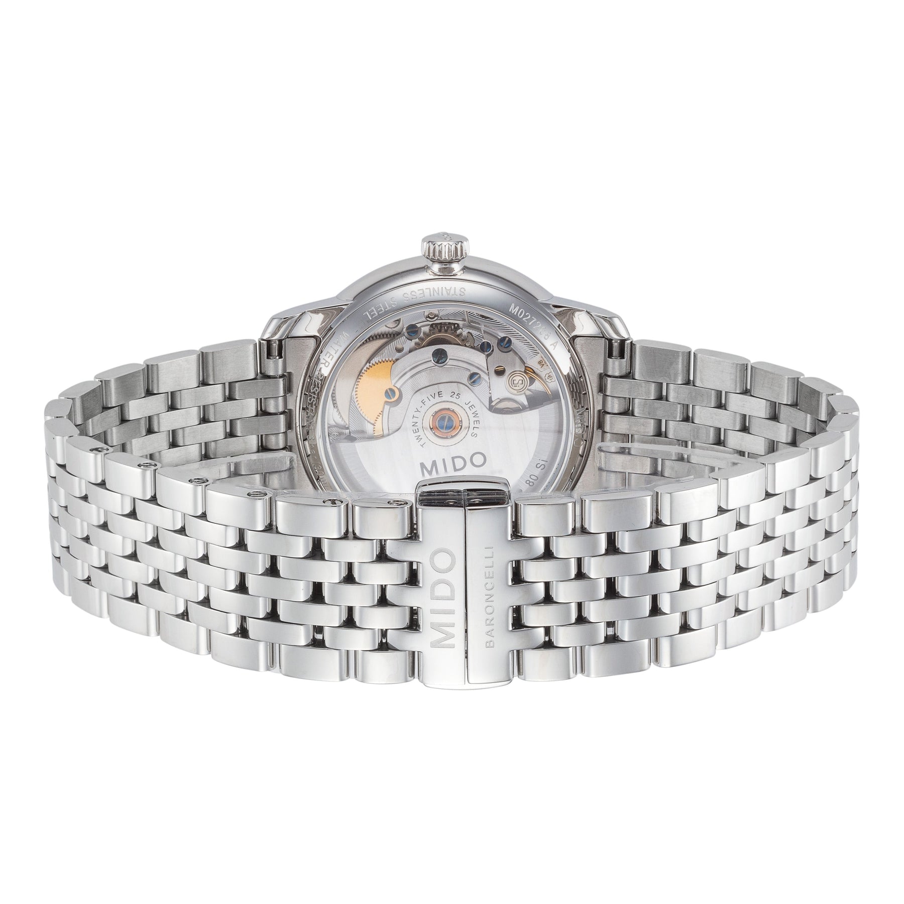 Collection Name: Baroncelli III, Case Shape: Round, Case Material: Stainless Steel, Case Width (mm): 34, Case Crystal: Sapphire Crystal Scratch Resistant, Case Water Resistance: 30 m (100 feet), Dial Color: White, Band Type: Bracelet, Band Material: Stainless Steel, Band Color: Silver, Band Clasp: Deployment Clasp, Movement Type: Automatic, Country of Origin: Made in Switzerland