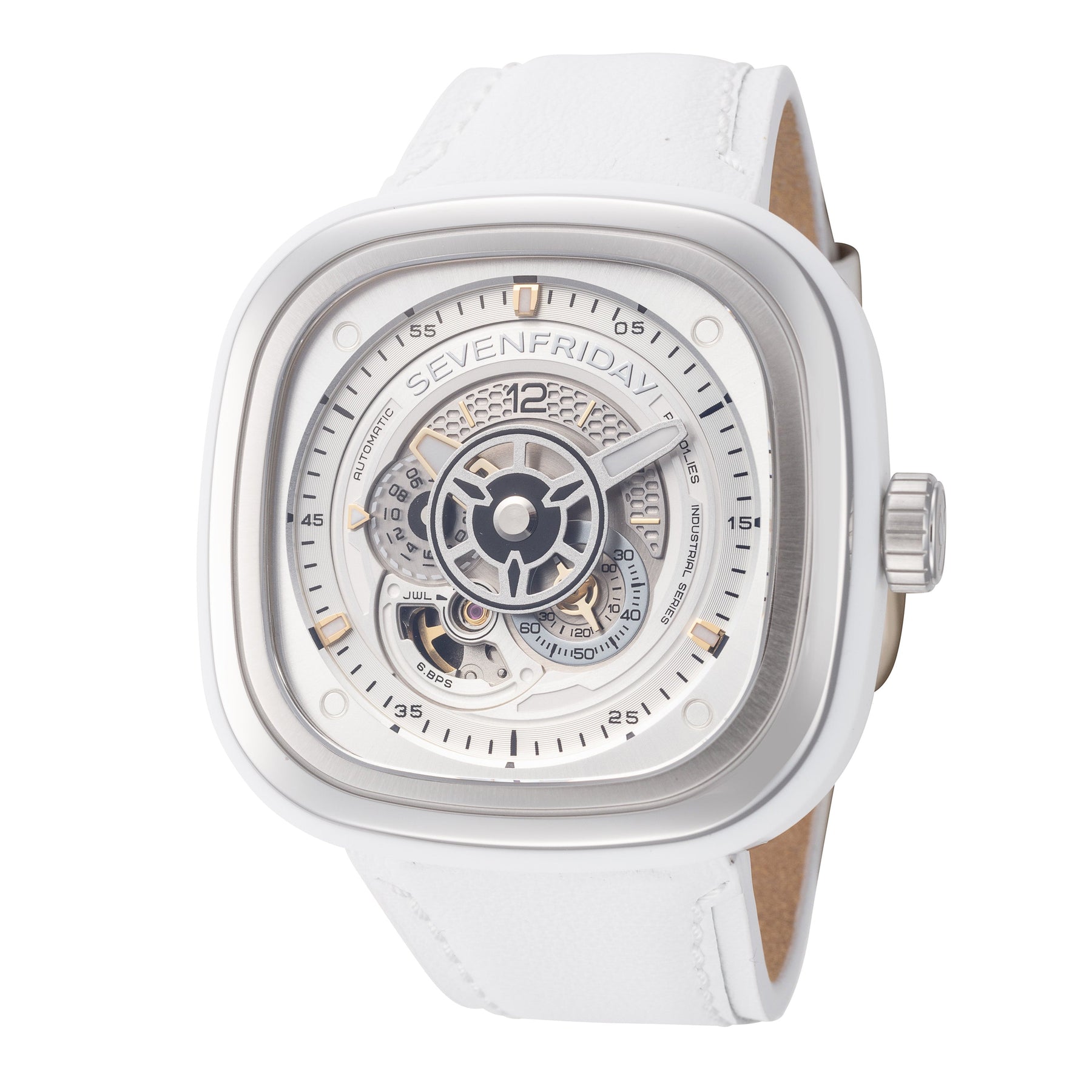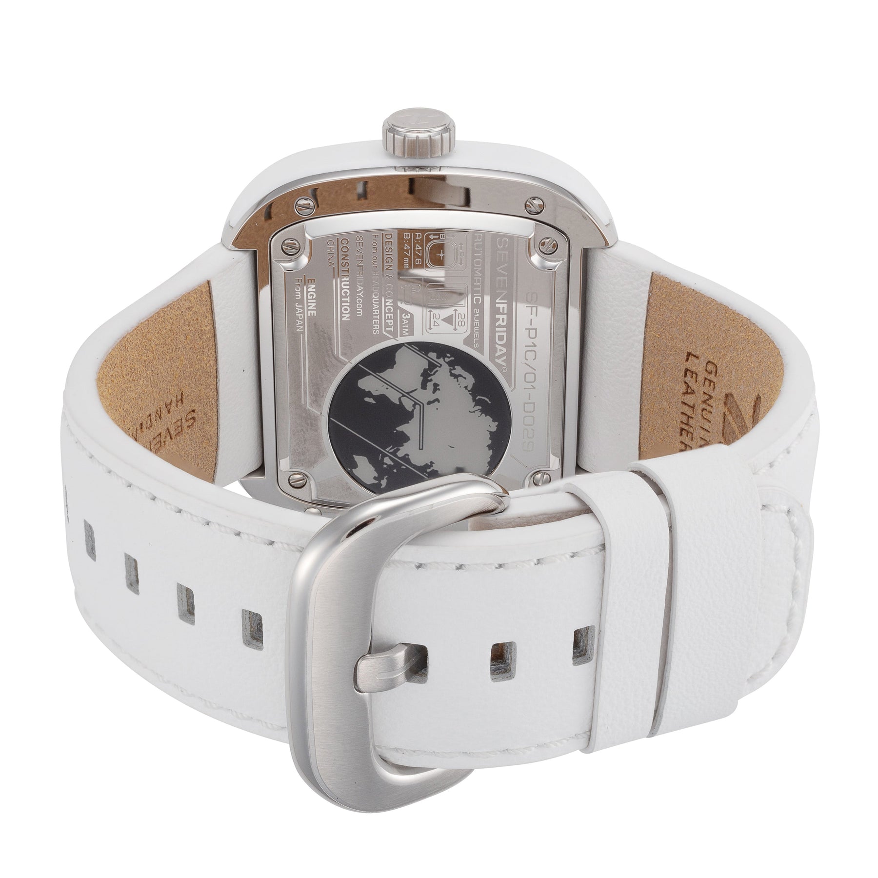Collection Name: Classic, Gender: Men's, Case Shape: Square, Case Material: Stainless Steel, Case Back: Closed, Case Width (mm): 47, Case Thickness (mm): , Case Crystal: K1 Mineral Crystal (Scratch Resistant), Case Water Resistance: 30 m (100 feet), Dial Color: White, Band Type: Strap, Band Material: Leather Calf Skin, Band Color: White, Band Length (in.): 7.5, Band Size Width (mm): 18, Band Clasp: Deployment Clasp, Features: , Movement Type: Automatic, Movement Caliber: Miyota 82S7, Movement Crown: , Country of Origin: Made in Japan,
