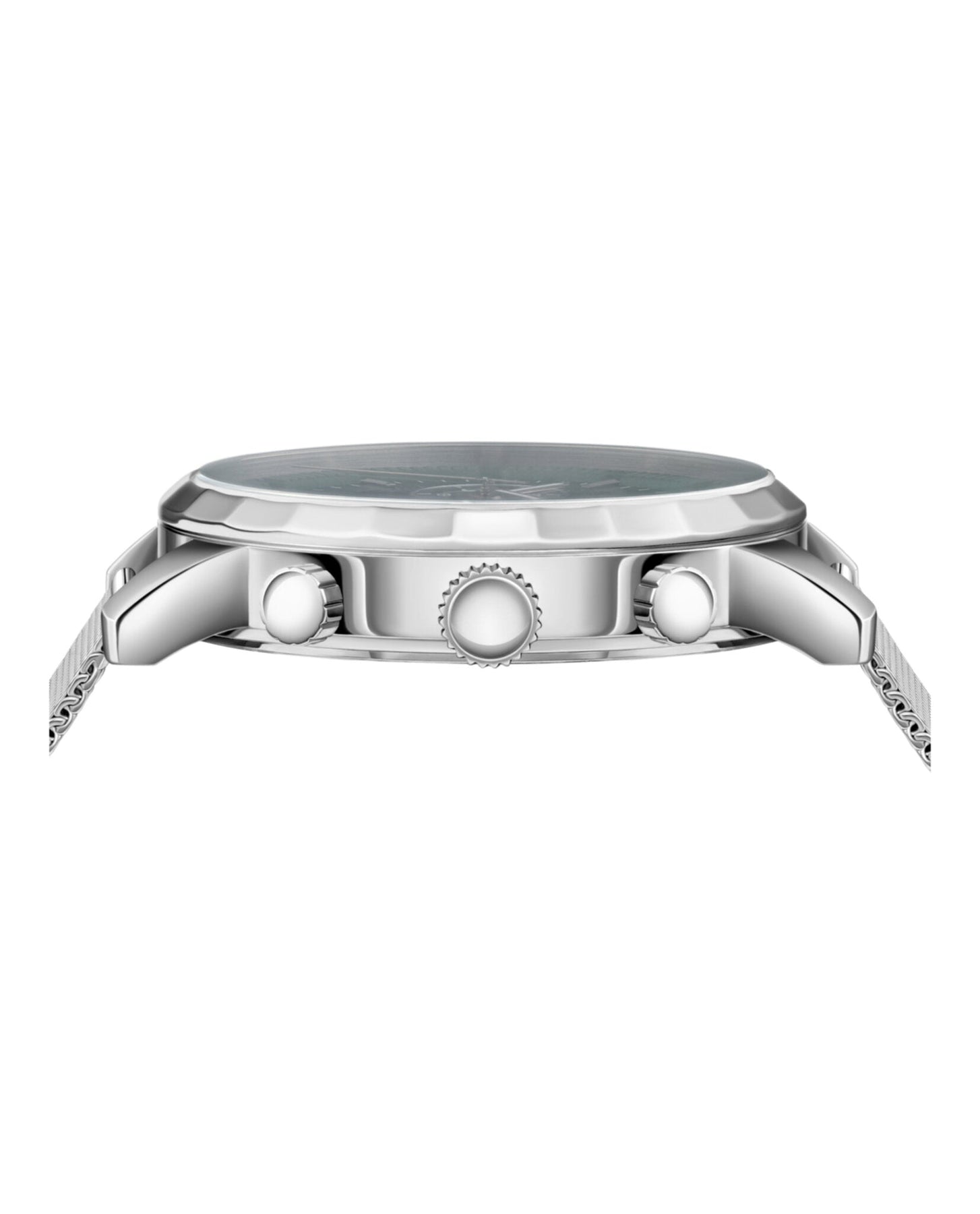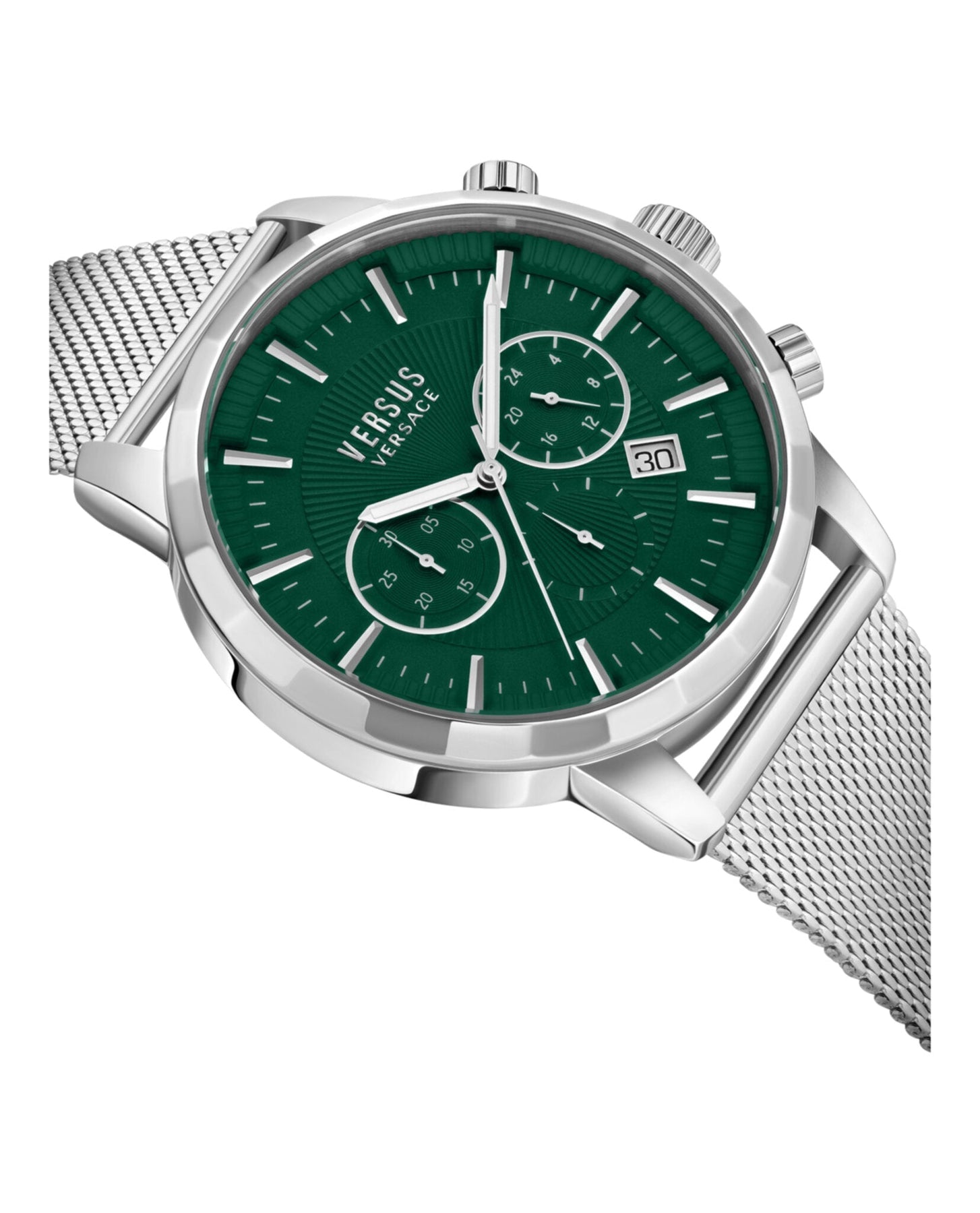 Versus Eug�ne is a classic yet modern gents collection. The 46mm case body is enriched with a diamond cut top ring. Chrono movement with 3 counters donates to this watch a sport chic look with very strong iconic connotation. Versus Eug�ne is offered in different plating and colors combination from classic to trendy as the IP grey with blue dial. The collection is offered in leather with stiches in contrast and in mesh band variation.