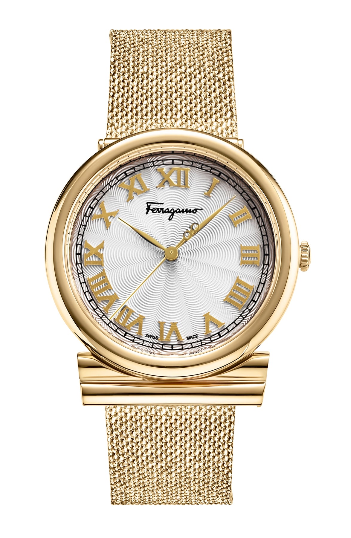 Ferragamo Women's SFUF00421 Gancino 34mm Quartz Watch Collection Name: Gancino ; Water Resistance: 30 m (100 feet) ; Dial Color: Silver ; Band Material: Stainless Steel ; Band Color: Gold ; Movement Type: Quartz