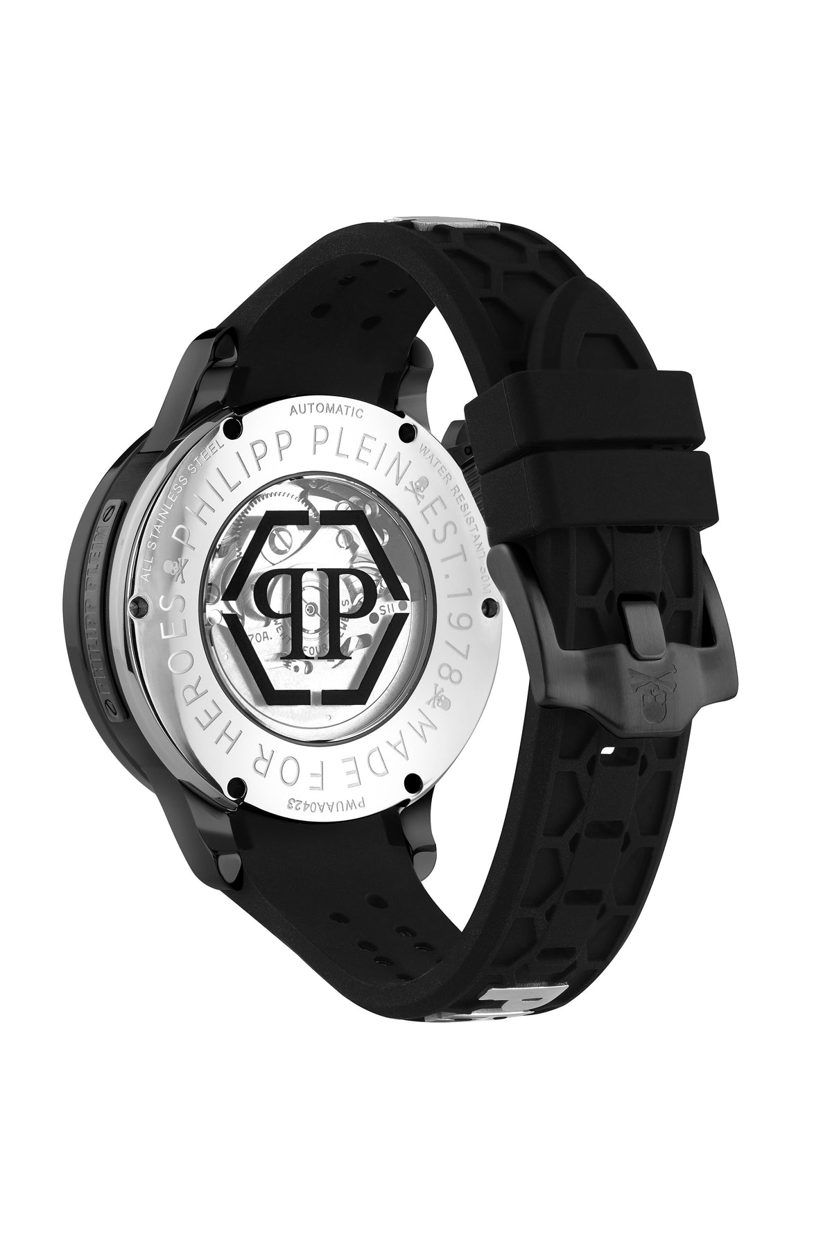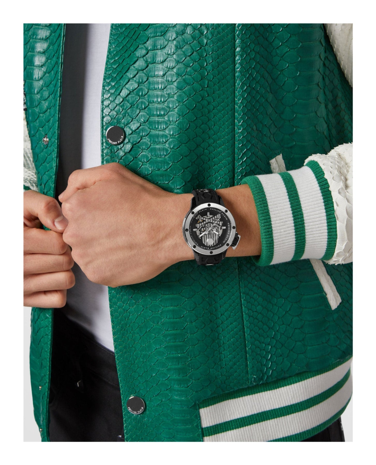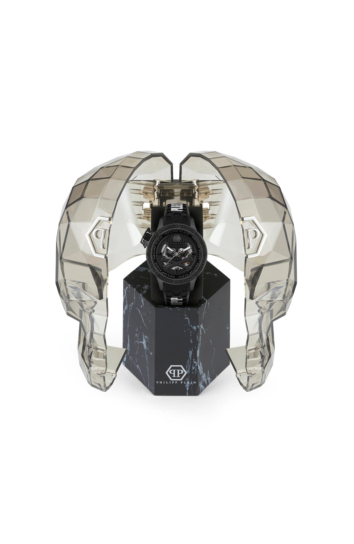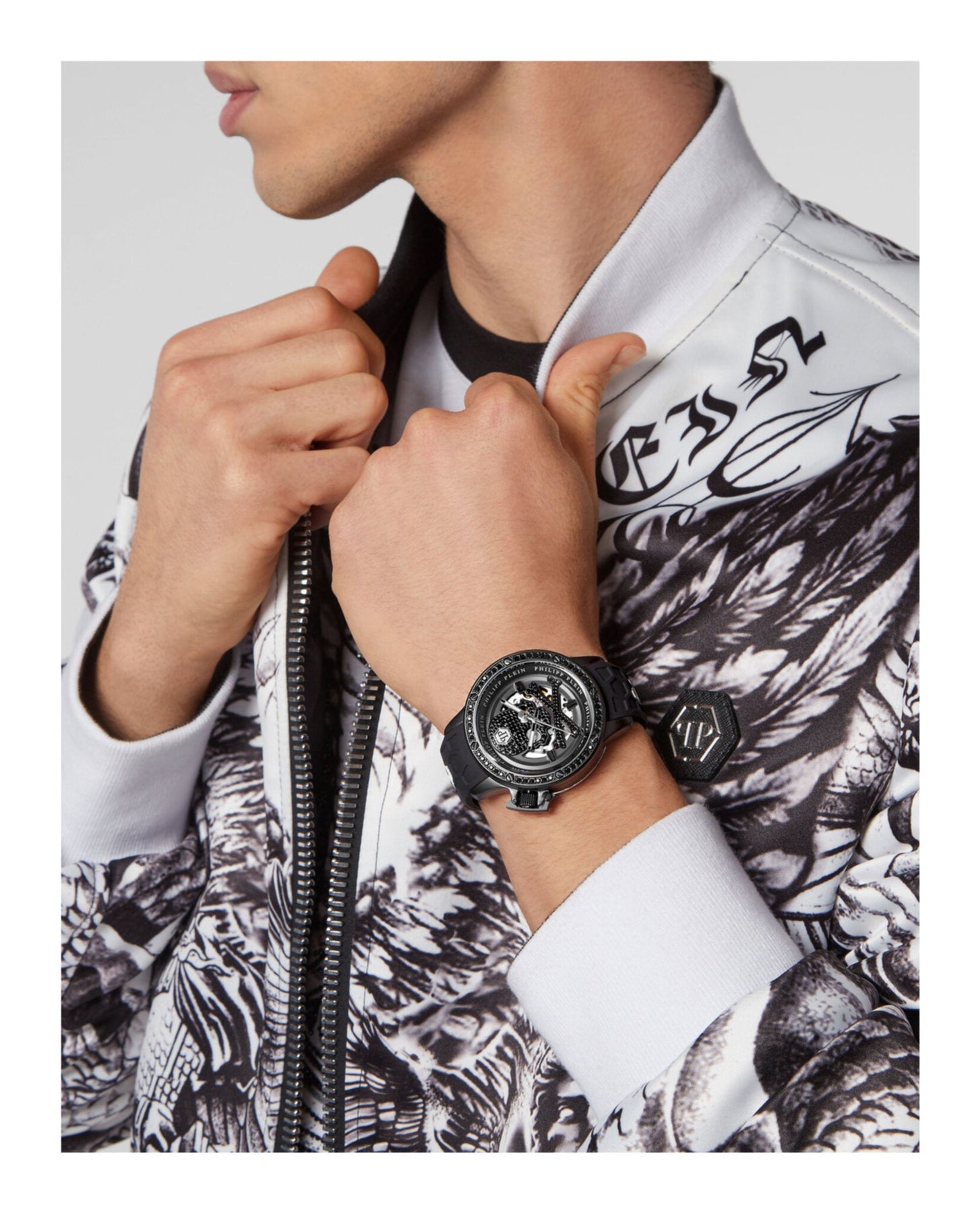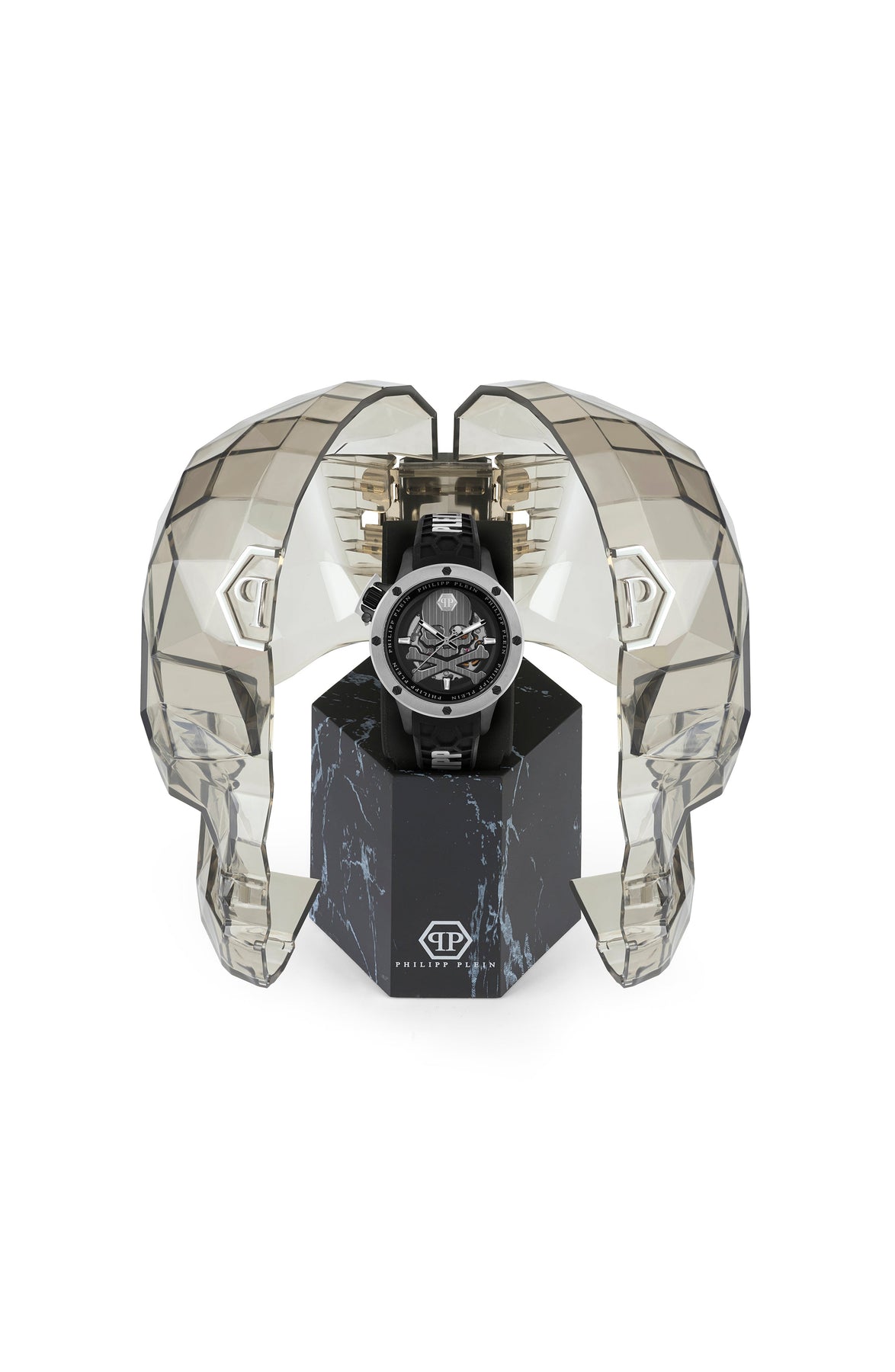 Plein Rich Mens Watch 46MM IP Black Case Black Skeleton Dial Silicone Strap