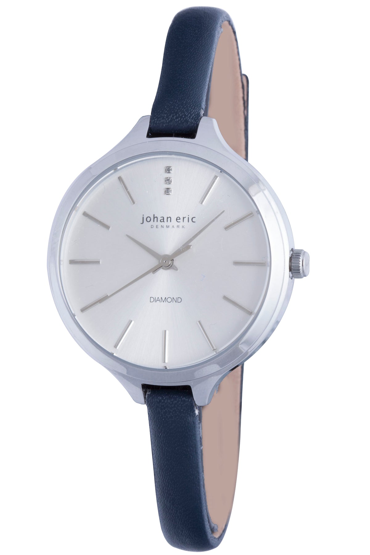 Johan Eric Women's Herlev Slim 35mm Quartz Watch JE2100-04-001.3 Collection Name: Herlev Slim ; Water Resistance: 30 m (100 feet) ; Dial Color: Silver ; Band Material: Leather Calf Skin ; Band Color: Blue ; Movement Type: Quartz ; Country of Orgin: Made in China